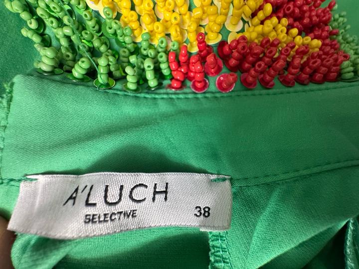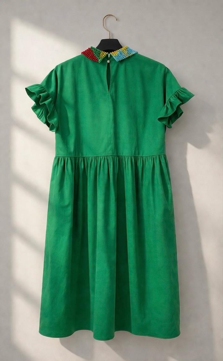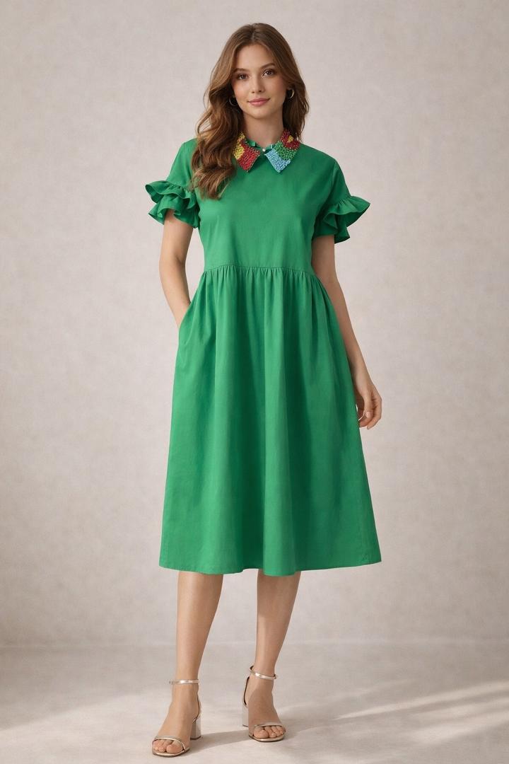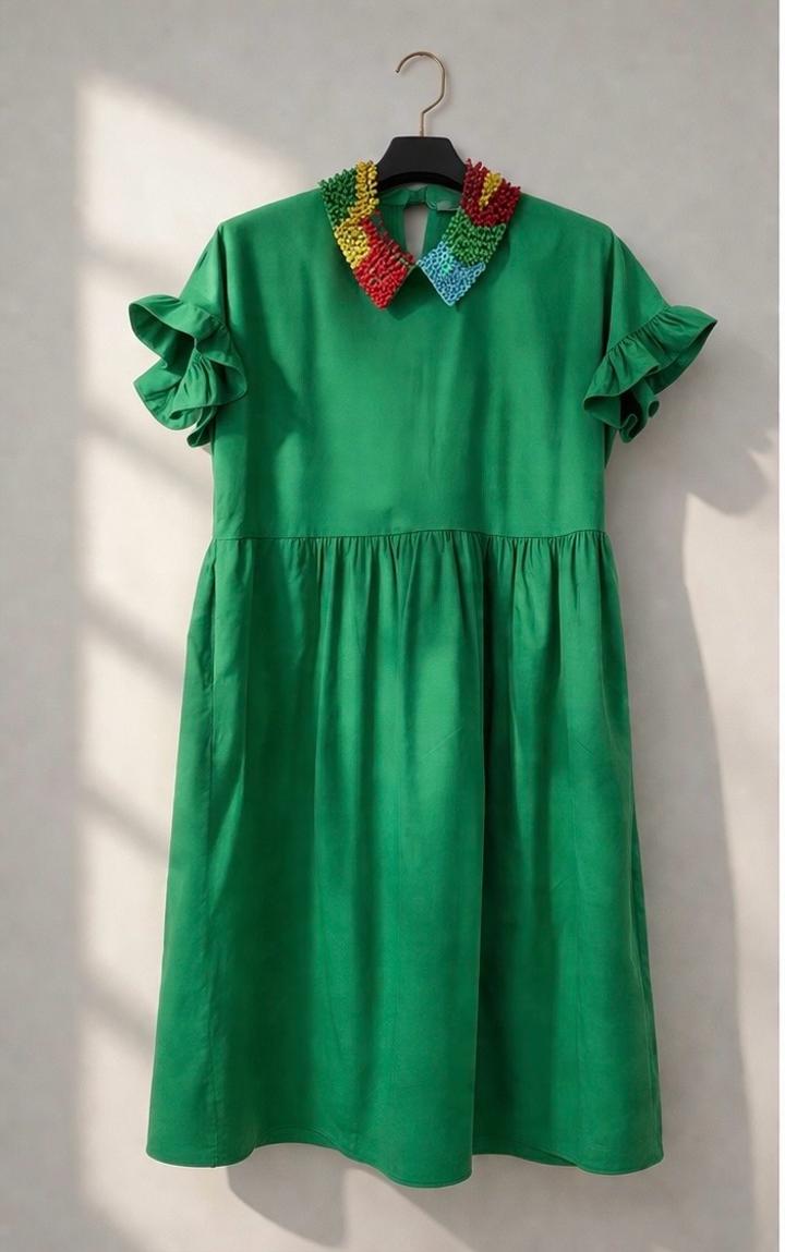 Стильное и очень необычное платье европейского бренда A'Luch. Яркий насыщенный зелёный цвет — освежает и делает образ дорогим. Главная изюминка — декоративный воротник с ручной вышивкой бисером it Смотрится как дизайнерская вещь, привлекает внимание с первого взгляда. — Плотный качественный материал — держит форму V Свободный крой — красиво садится и скрывает нюансы —Удобное и эффектное одновременно «Вживую выглядит намного дороже» Артикул: 569339