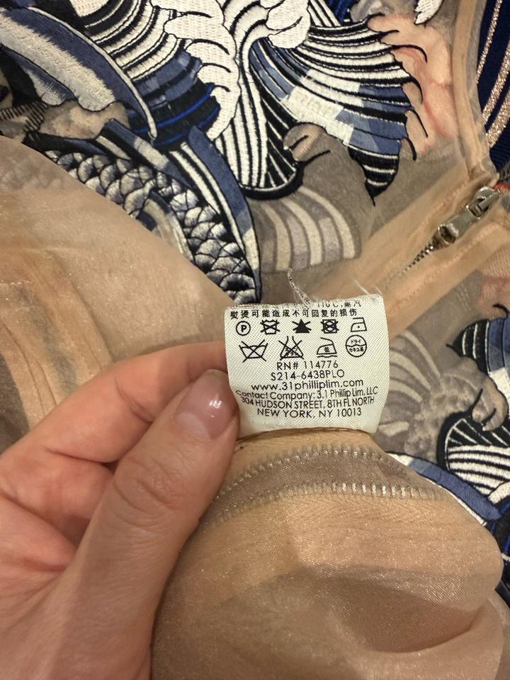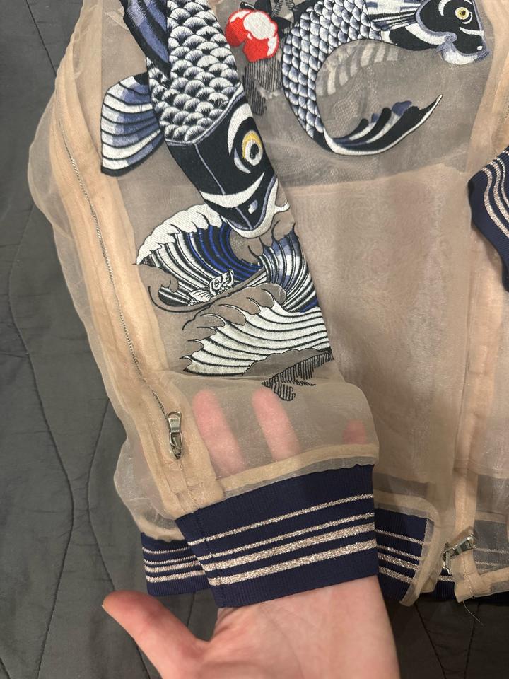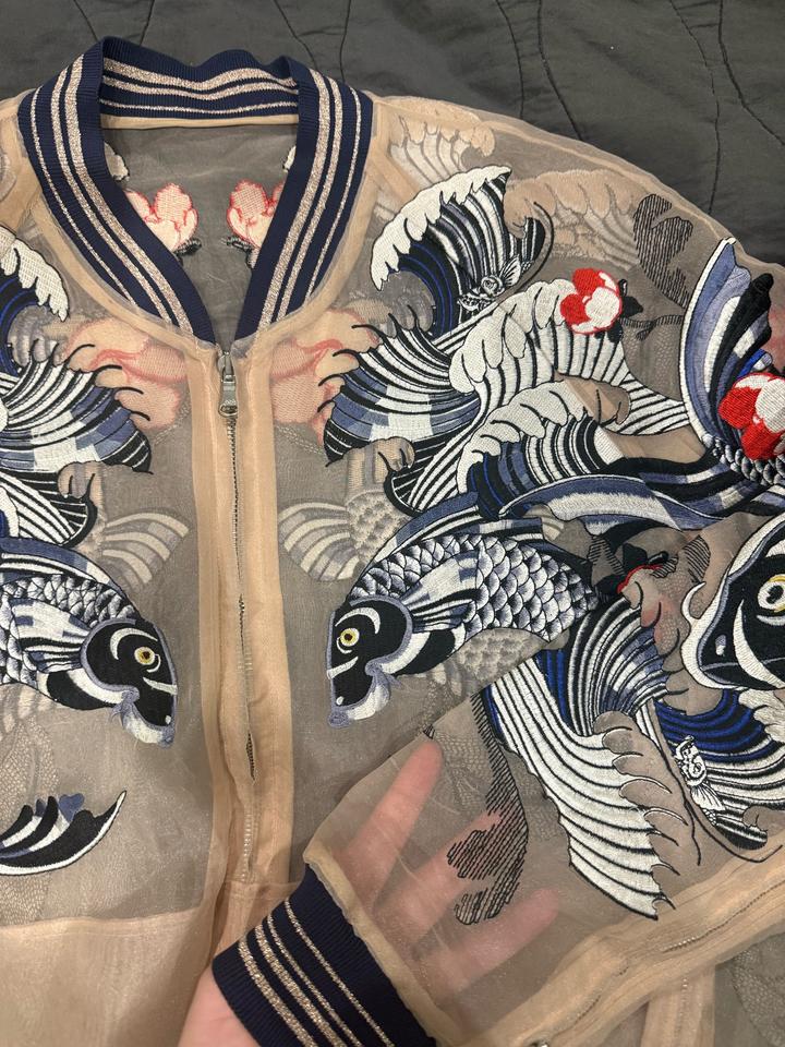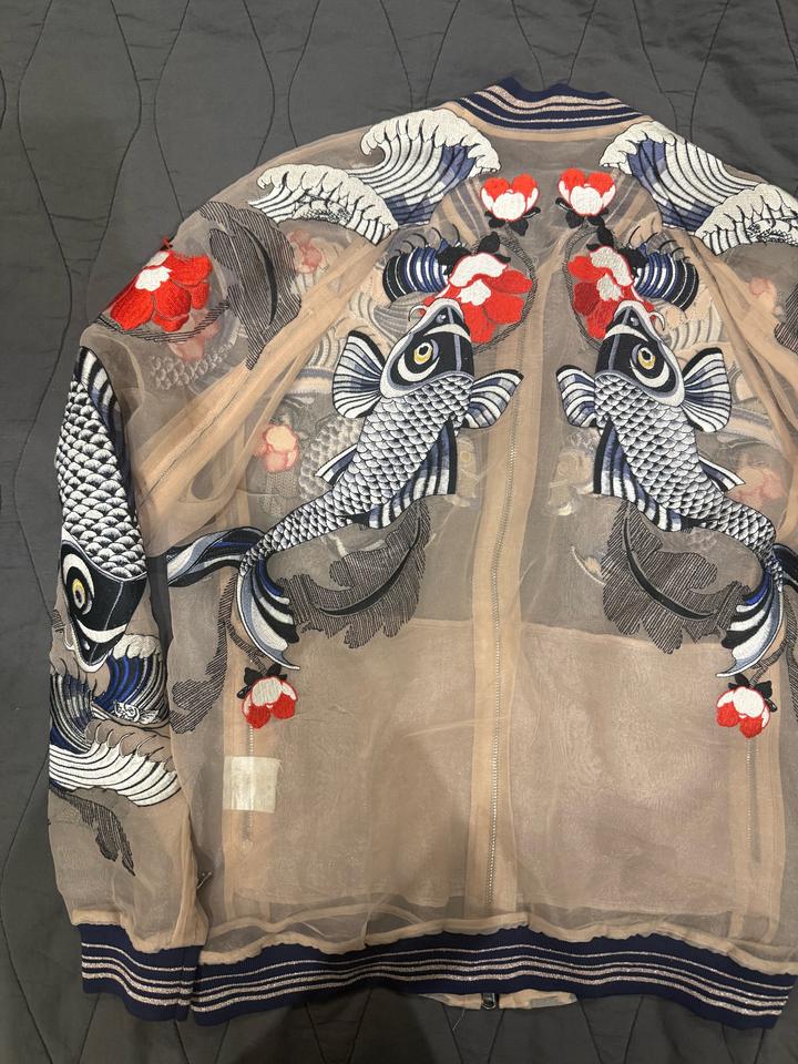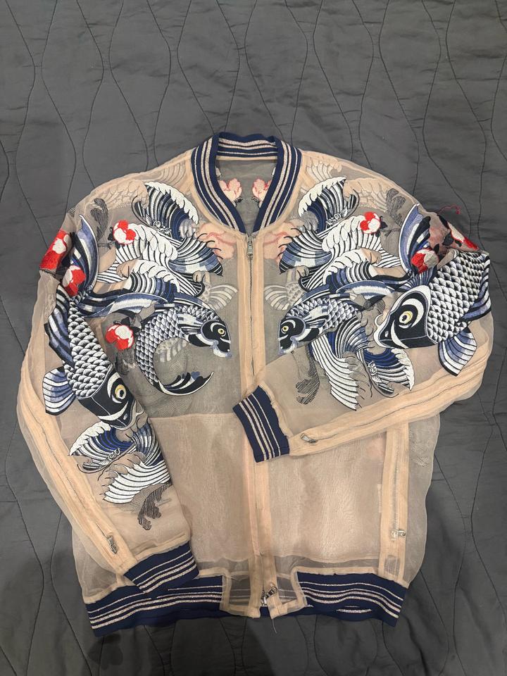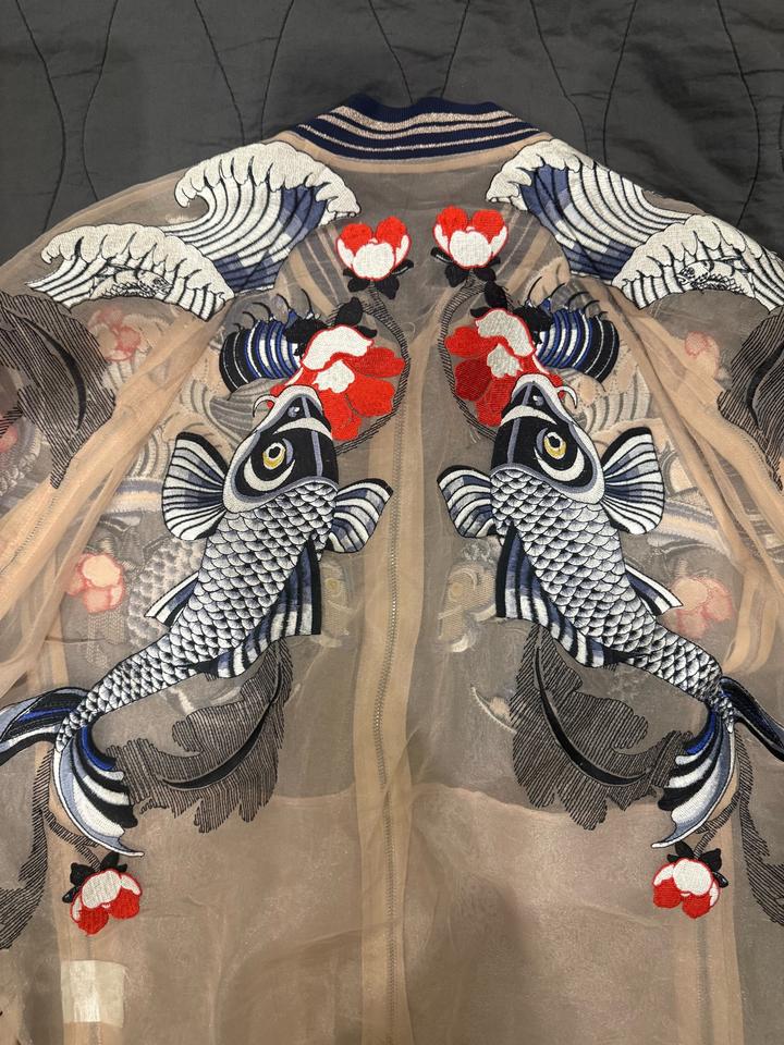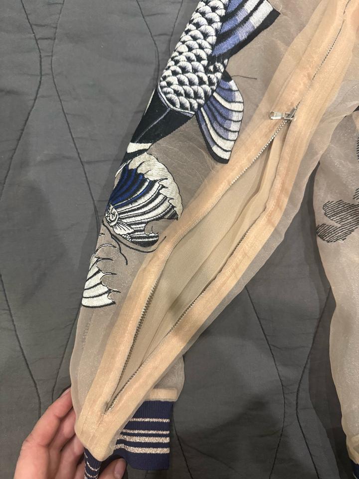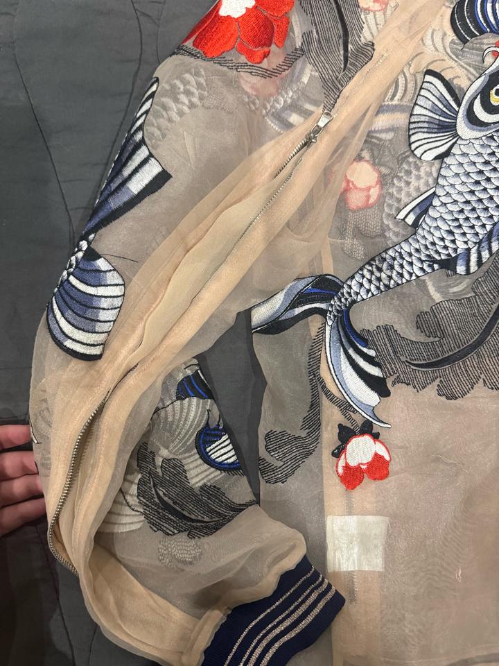 Бомбер из органзы. Летний, легкий. Особо не греет, функционал несет эстетический, очень необычный, прозрачный с вышивкой карпов, интересные детали - молнии на рукавах делают рукава шире, с карманами. Артикул: 569413