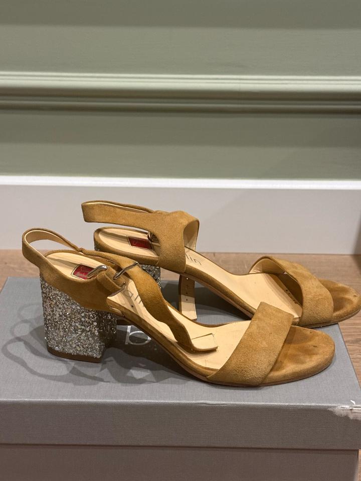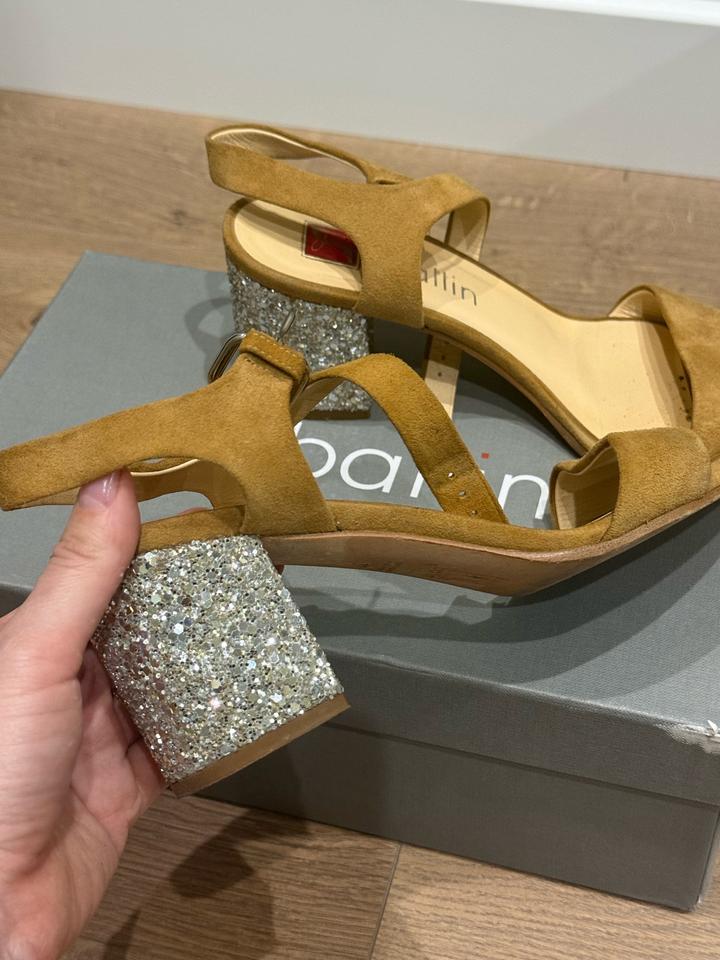 Бежевые замшевые босоножки с блестками на каблучке. Удобные, универсальный цвет но при этом каблук придает изюминку Артикул: 569475