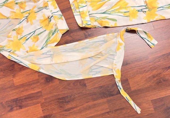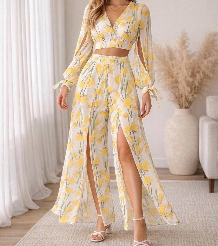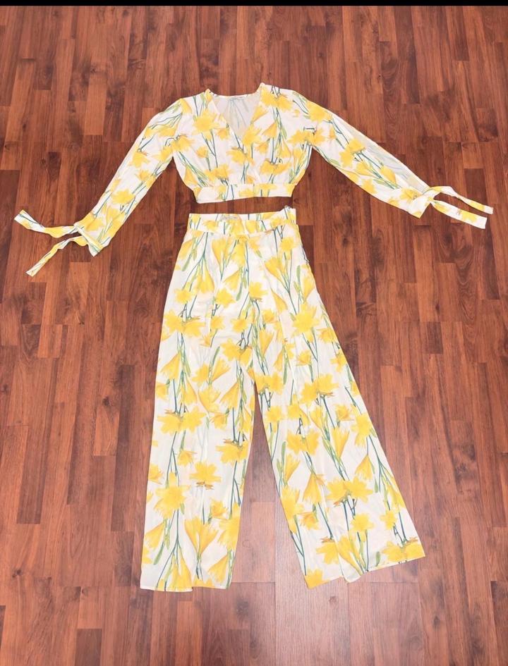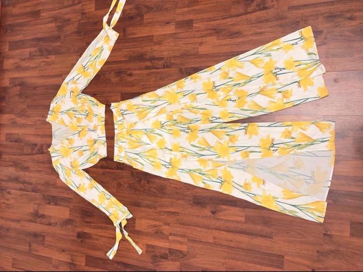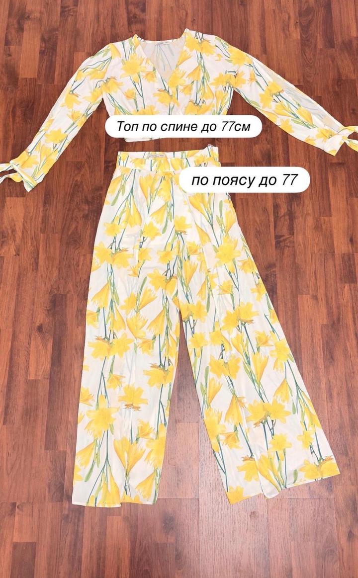 Лёгкий комплект из полупрозрачной приятной к телу ткани (шифон): укороченный топ с длинными рукавами и широкие брюки-палаццо с высокой посадкой. Принт цветочный 2025/26 года Топ: завязки на запястьях, рукава с аккуратными вырезами, деликатно скрывают зону рук. Брюки: с разрезами, при ходьбе видна только передняя часть ног. Вшитые шортики — ничего не просвечивает. Брюки по талии см в карусели Одет был 1 раз Артикул: 569686