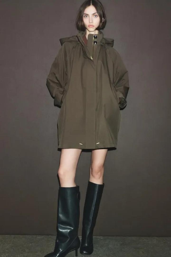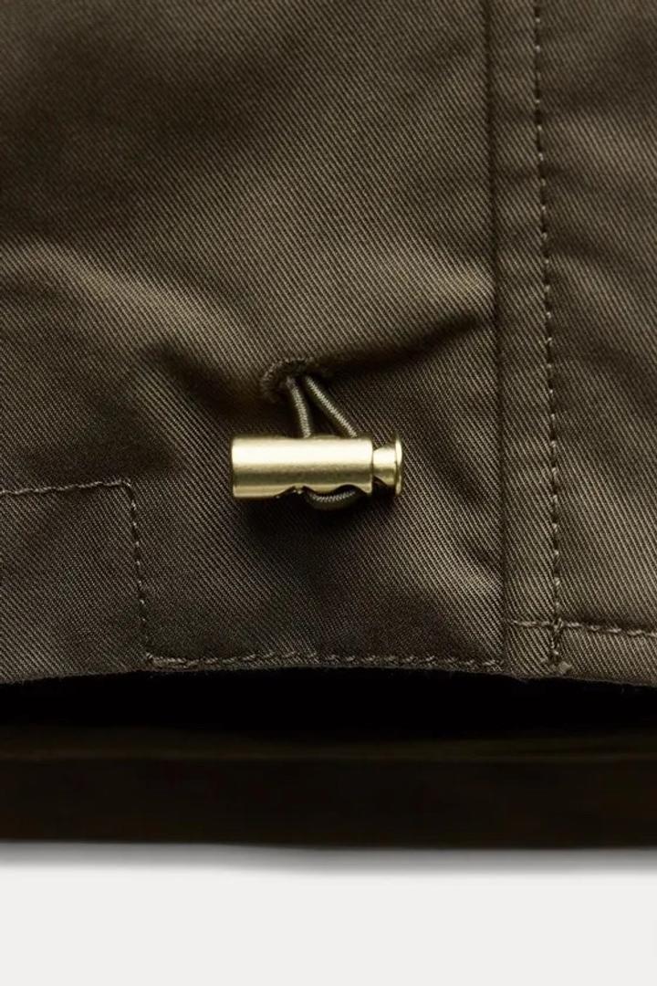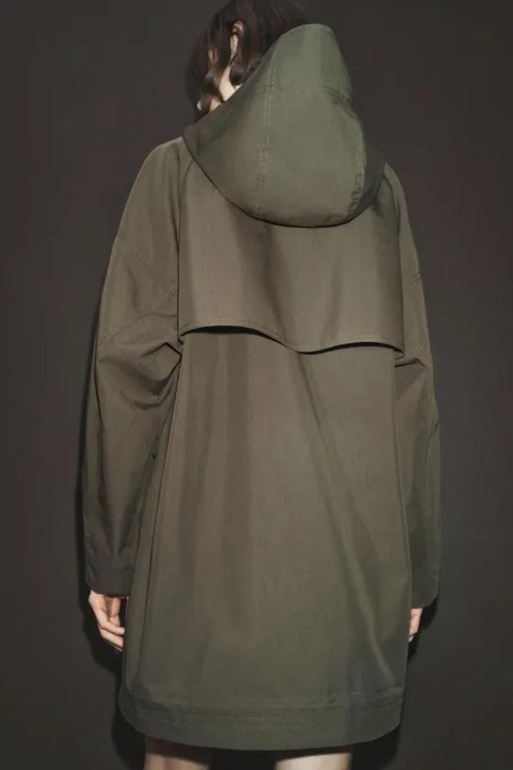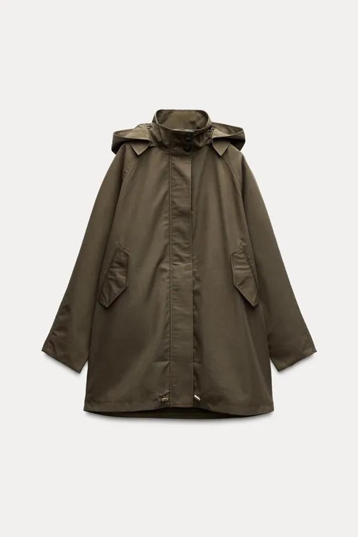 Коллекция Zara «ZW» Тренч с высоким воротником и отстегивающимся капюшоном с пуговицами. Длинные рукава, передние карманы с клапанами. Декоративная строчка в тон, регулируемый низ на эластичных шнурках с фиксаторами. Металлическая застежка-молния под планкой с пуговицами. Артикул: 569849