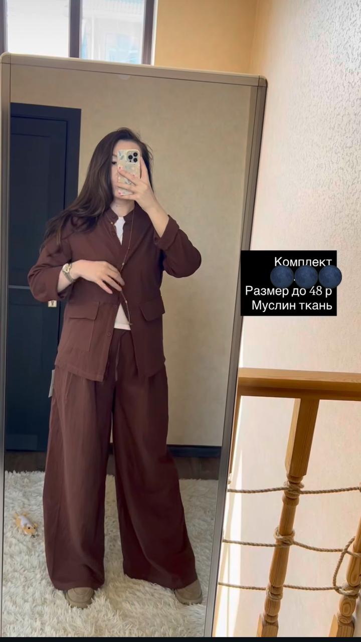 Коричневый комплект двойка. Материал хлопок-муслин. Очень приятный. Размер до 46 р подойдет. Для высоких девушек самое то. Новый с бирками. Завтра до обеда нужно продать, так как уезжаю. Положу не большой презент от меня🙏🏻 Артикул: 569882