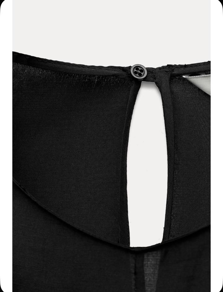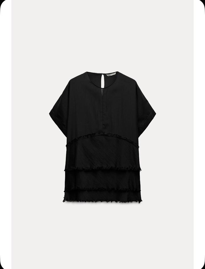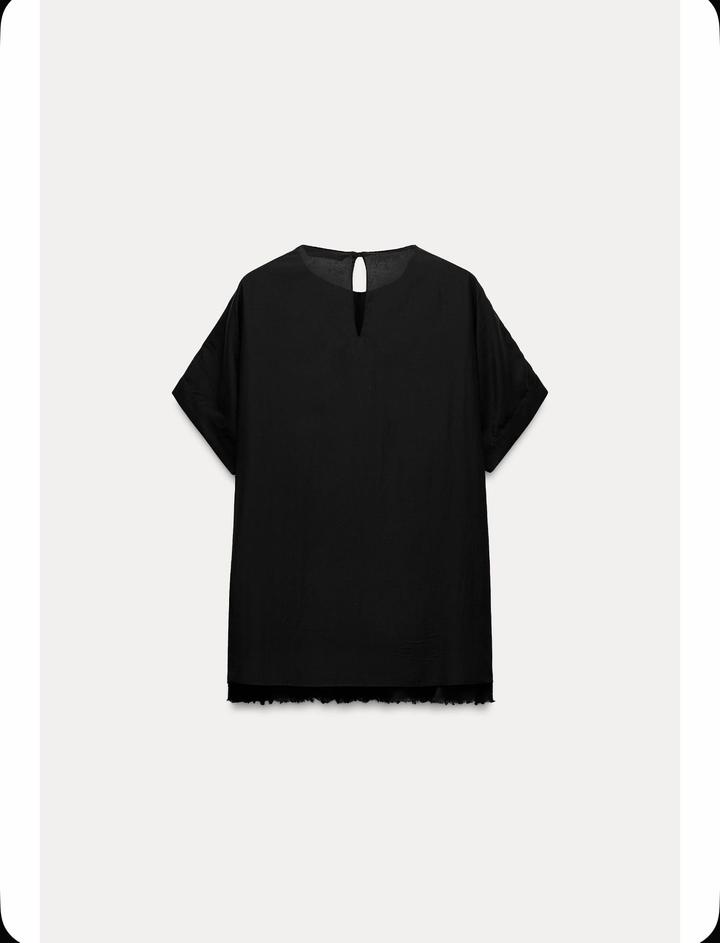 ZARA WOMAN COLLECTIONТоп из вискозы и хлопка с круглым вырезом и короткими рукавами. Воланы из той же ткани, необработанные кромки. Вырез с пуговицей сзади. Носила только 1 раз, после уже стали малы 🥹 Артикул: 569990