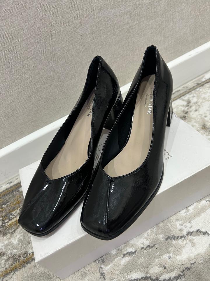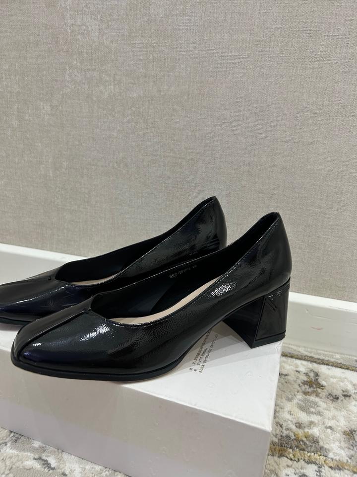 Чёрные лакированные туфли, выполнены из аккуратного материала. Носок закрытый, слегка заострённой формы. Каблук средней высоты. Носились несколько раз, в хорошем состоянии. Артикул: 570076