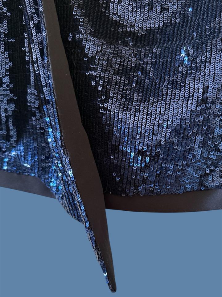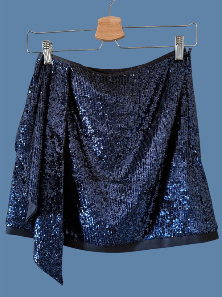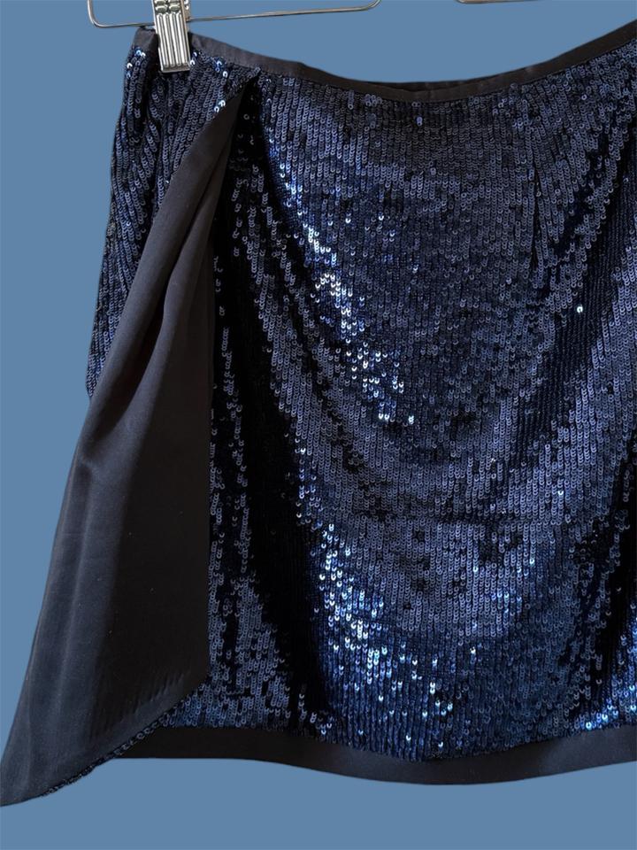 Короткая юбка с драпировкой спереди, создающей асимметричный крой «на запах», и расшита темно-синими пайетками Артикул: 570205