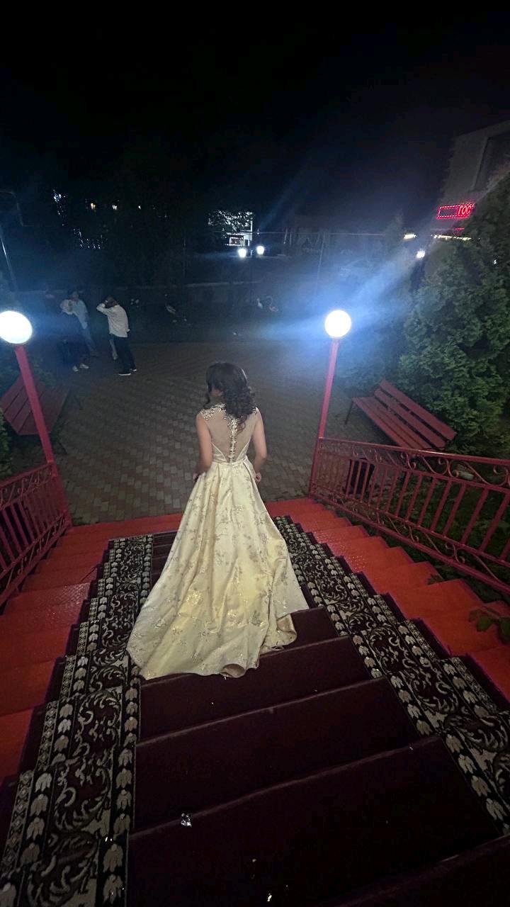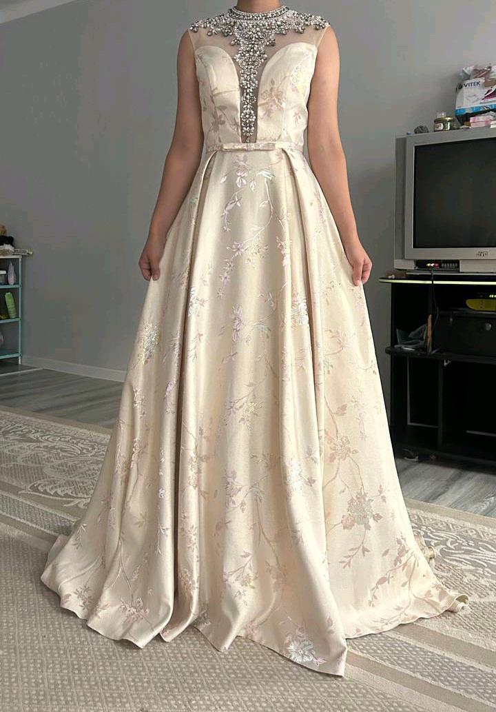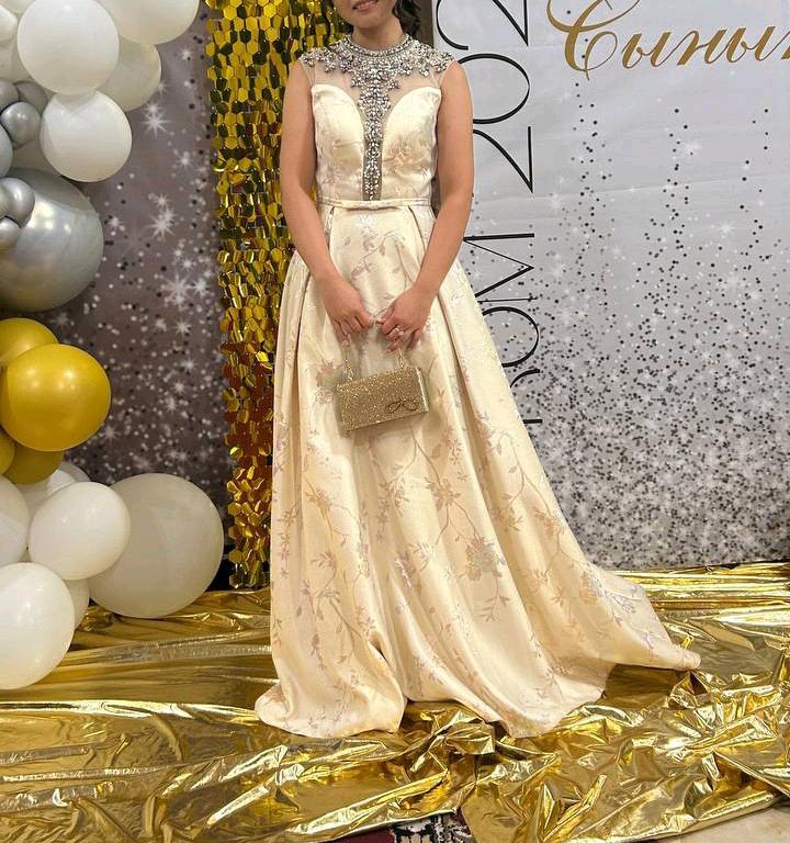 Вечернее или выпускное платье кремового цвета с цветочным узором и декорированной камнями верхней частью.Дефекта нету . Одевали 1 раз. Рост девушки 164см Артикул: 570319