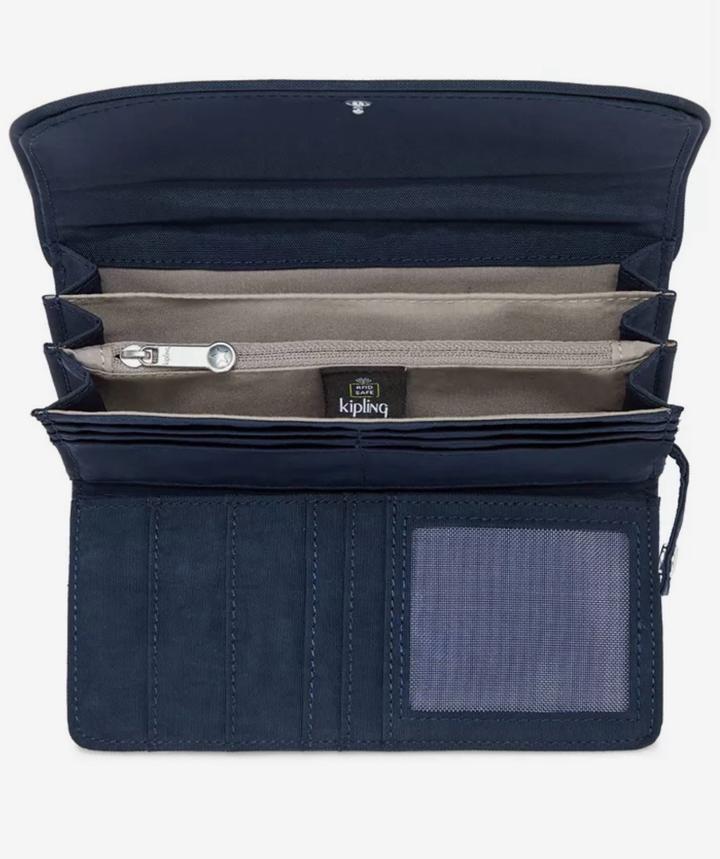 Нейлоновый кошелек Kipling темно синего цвета.Новый. Магнитная застежка Металлические детали серебристого цвета 1 внутренний карман на молнии и 1 слот для удостоверения личности 5 карманов для наличных и 10 слотов для кредитных карт Защита RFID Легкая очистка Артикул: 570516