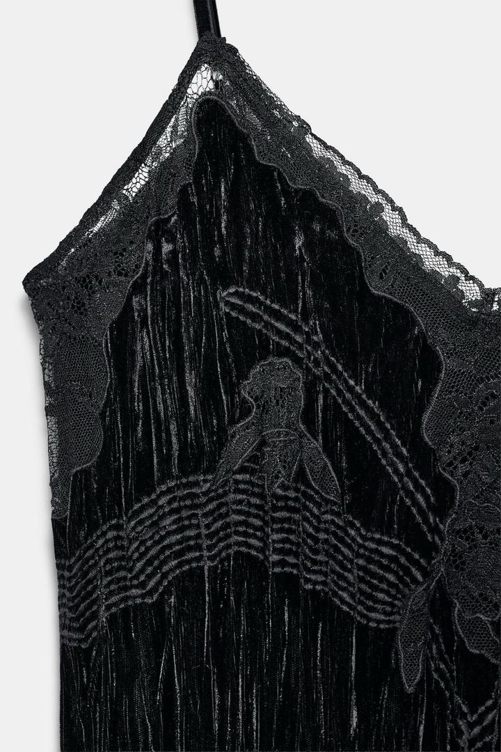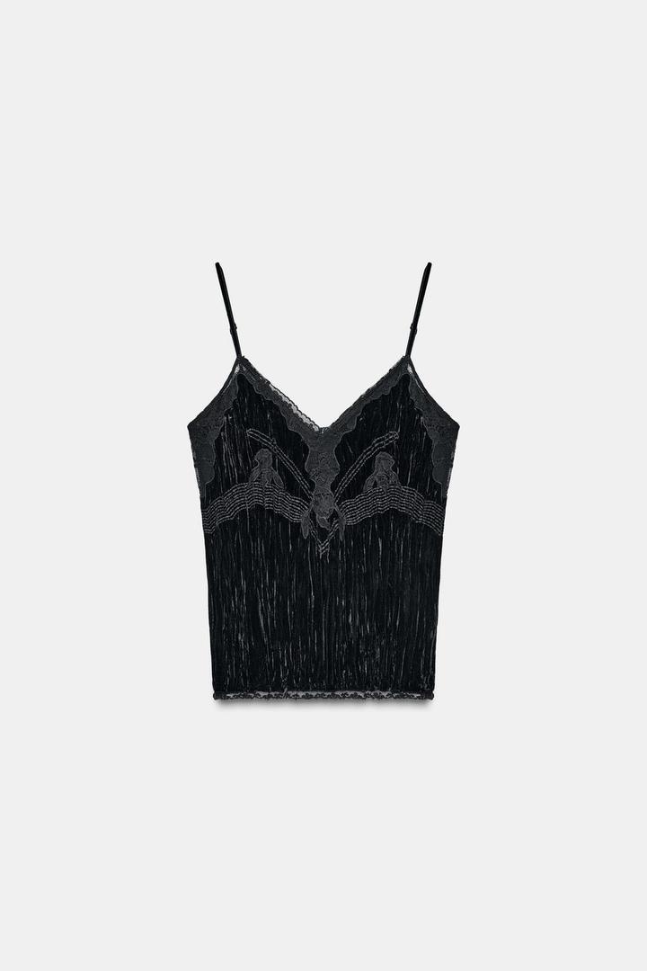 Бархатный топ из жатого бархата с V-образным вырезом и тонкими регулируемыми бретелями. Кружевная отделка в тон. Прямой низ Размер М Артикул: 570708