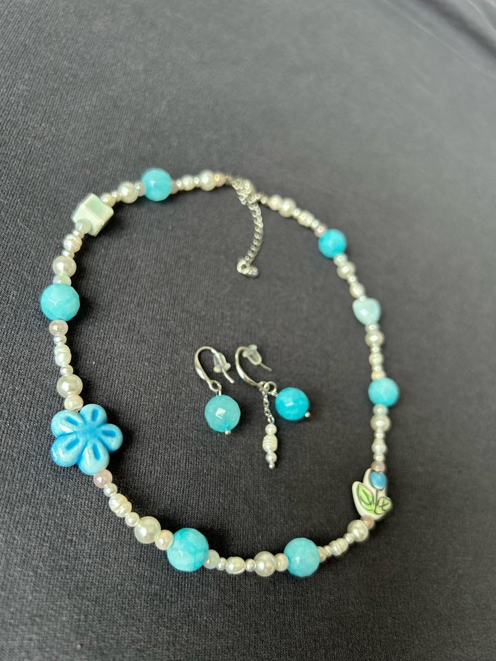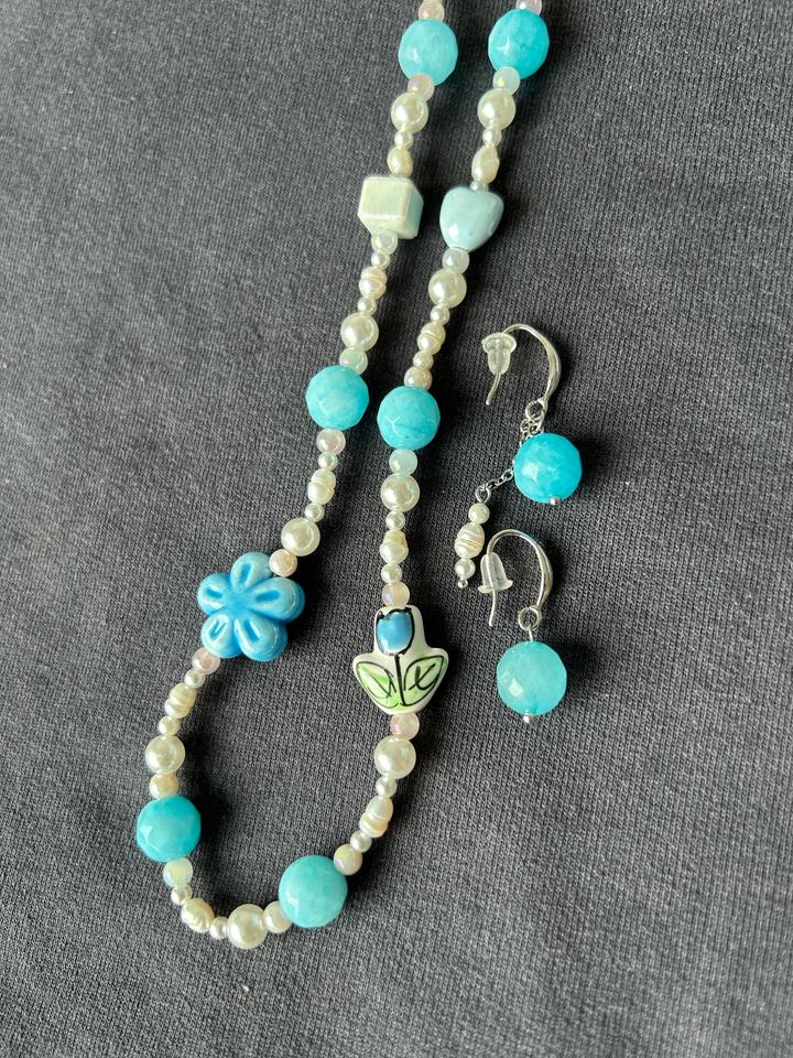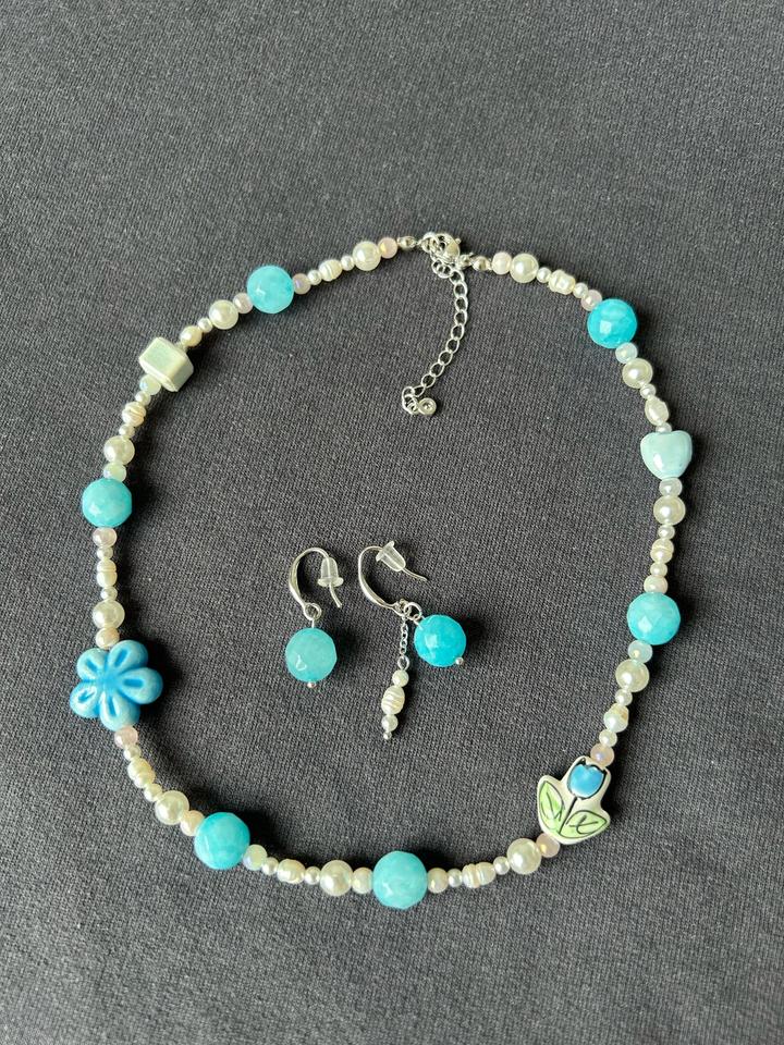 Колье ручной работы из агата ,жемчуга,керамики и майорки Длина 38 см + 5 см на регулирование Фурнитура люкс Серьги в комплекте жемчуг и агат Артикул: 570906
