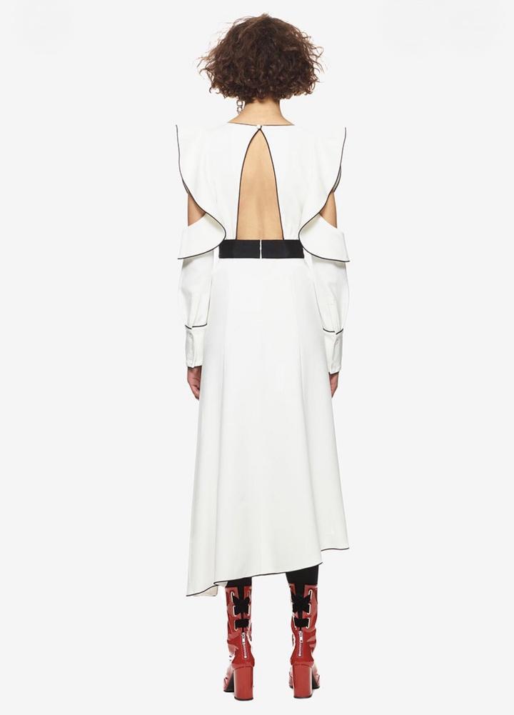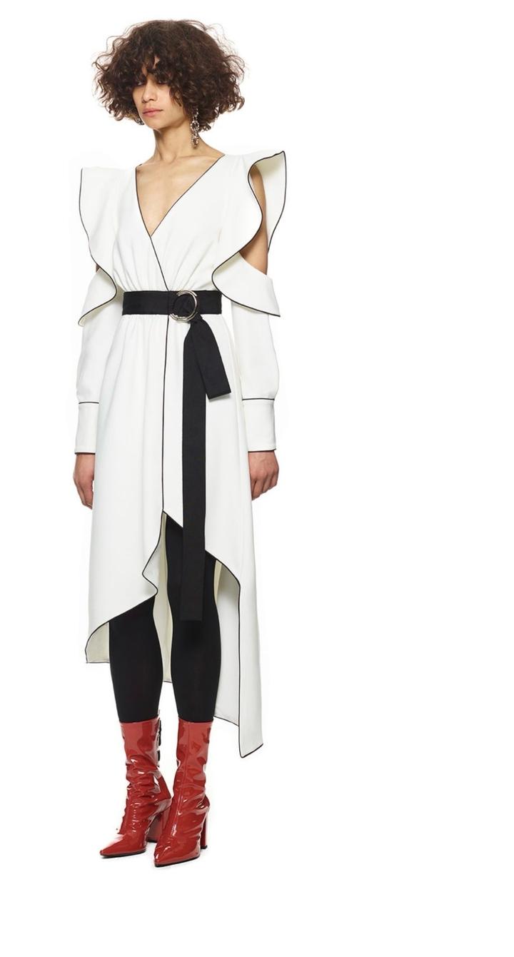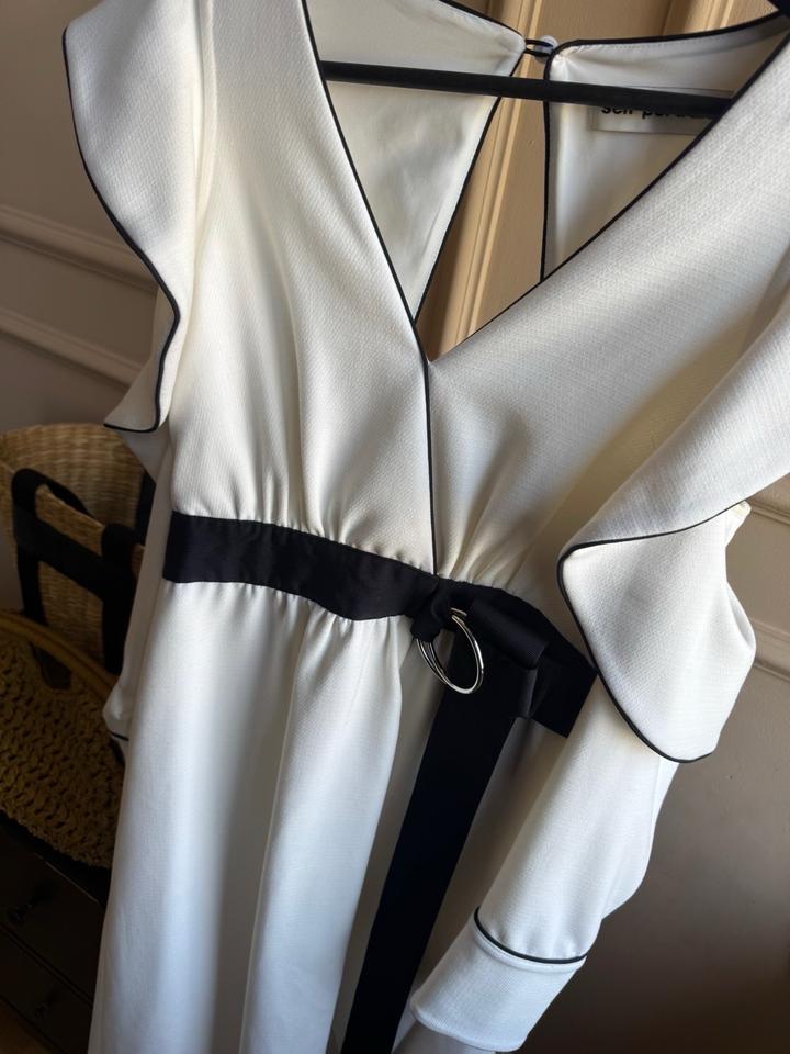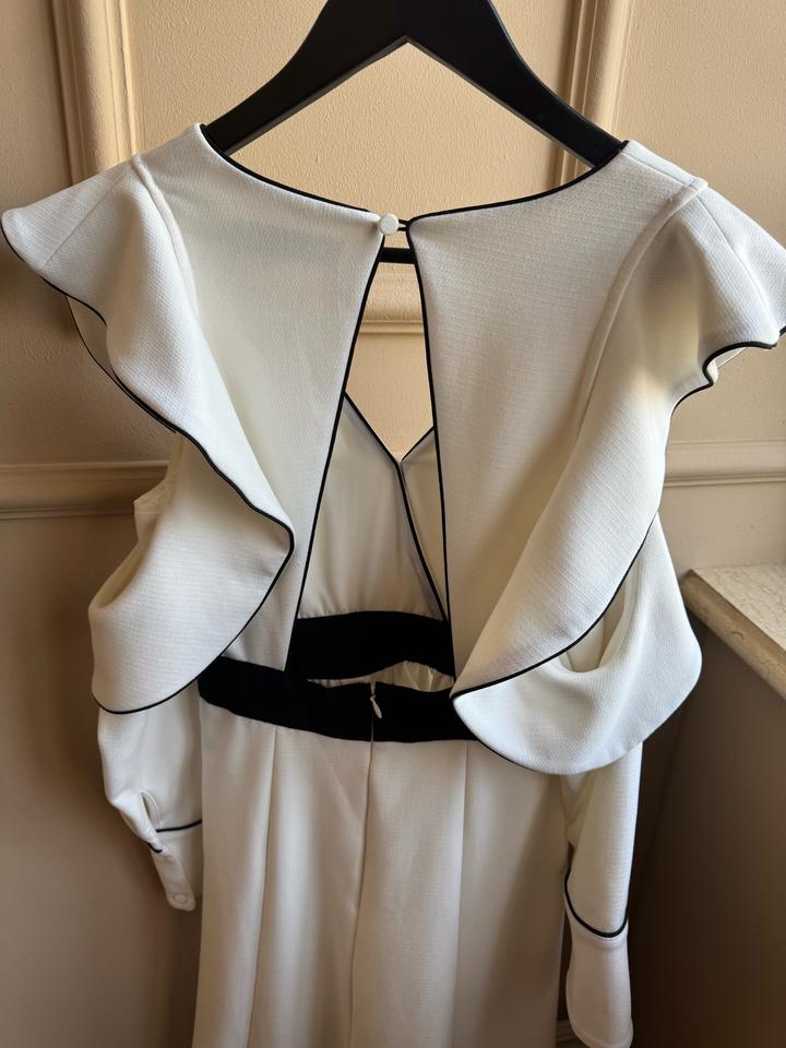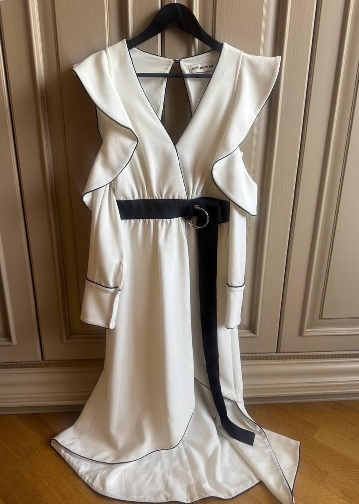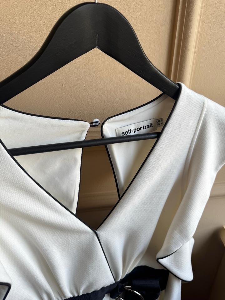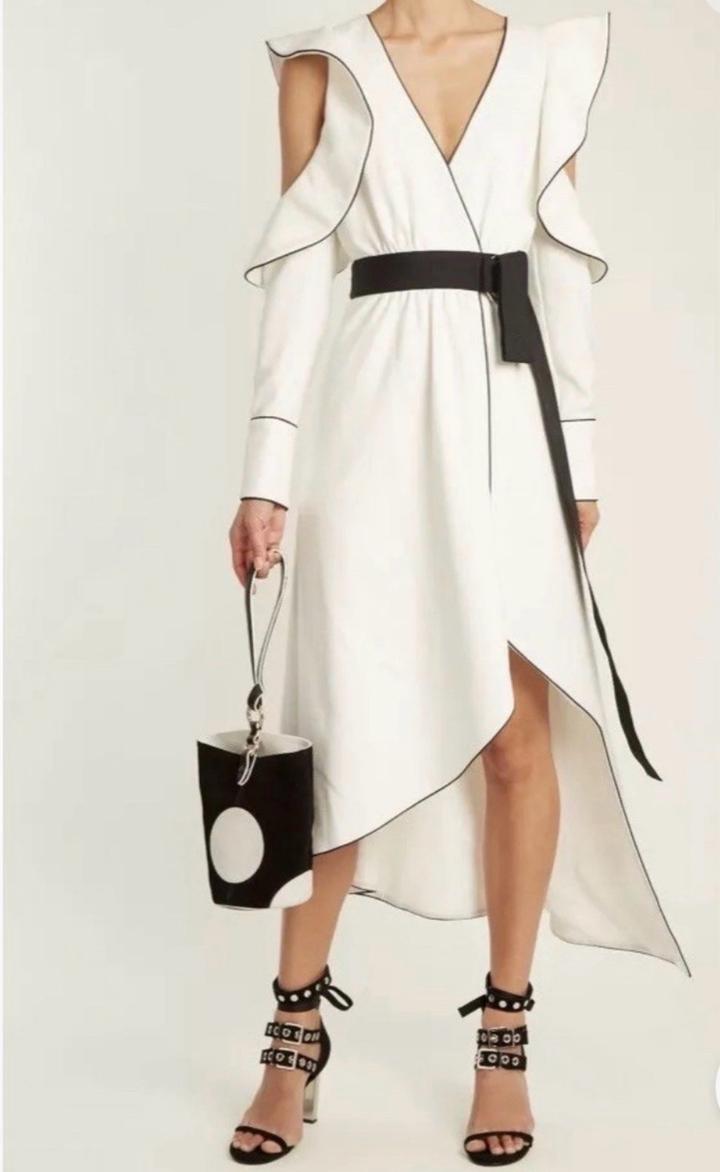 Monochrome Asymmetric Wrap Dress от Self-Portrait. Модель выполнена из белого крепа с контрастной черной отделкой по краям. Вшитый черный пояс из корсажной ленты с серебристым кольцом подчеркивает талию и фиксирует имитацию запаха. Платье безумно красивое! Было надето один раз! В идеальном состоянии. Размер UK8. ( S) Примерные параметры фигуры для размера UK 8: Обхват груди: ~80–83 см Обхват талии: ~64–68 см Обхват бедер: ~90–94 см Артикул: 570957
