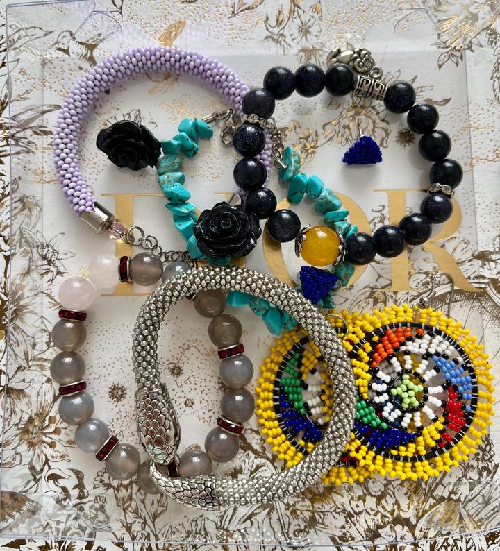 Сережки, браслет из бисера из ЮАР Браслеты: бирюза, гематит, раухтопаз, розовый кварц Цена 5990 за все украшения Артикул: 571022