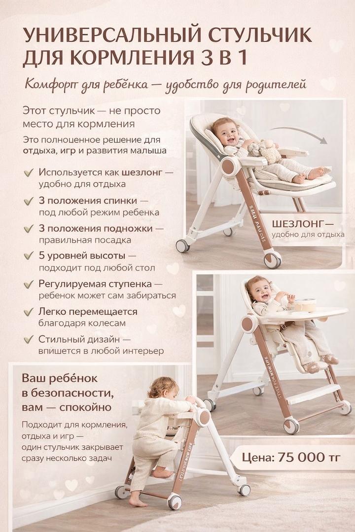 Новый Стульчик для кормления Berny V2. Можно использовать как шезлонг. Пятиточечные ремни безопасности .Съемный поднос. Молочный цвет. Цена 75 000 тг Артикул: 571036