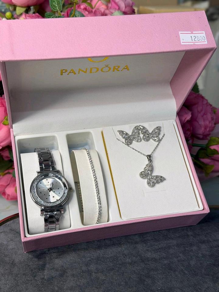 Женский набор Пандора В комплекте: часы Пандора, браслет, цепочка и Серёжки всё в одной коробке Артикул: 571074