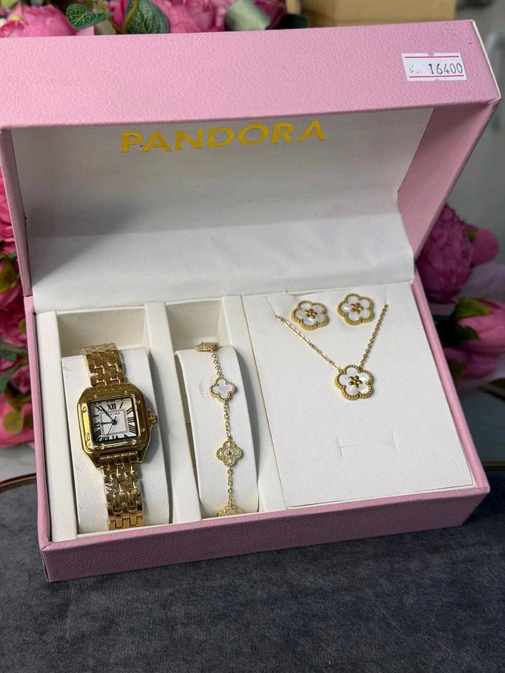 Женский набор коробка от Пандоры В комплекте: часы Cartier, браслет, цепочка и Серёжки всё в одной коробке Артикул: 571087