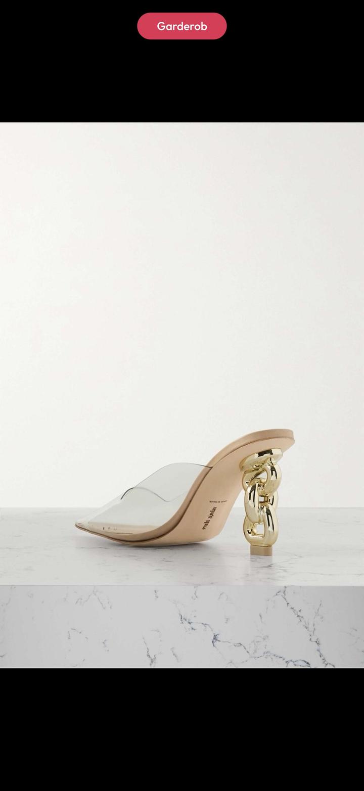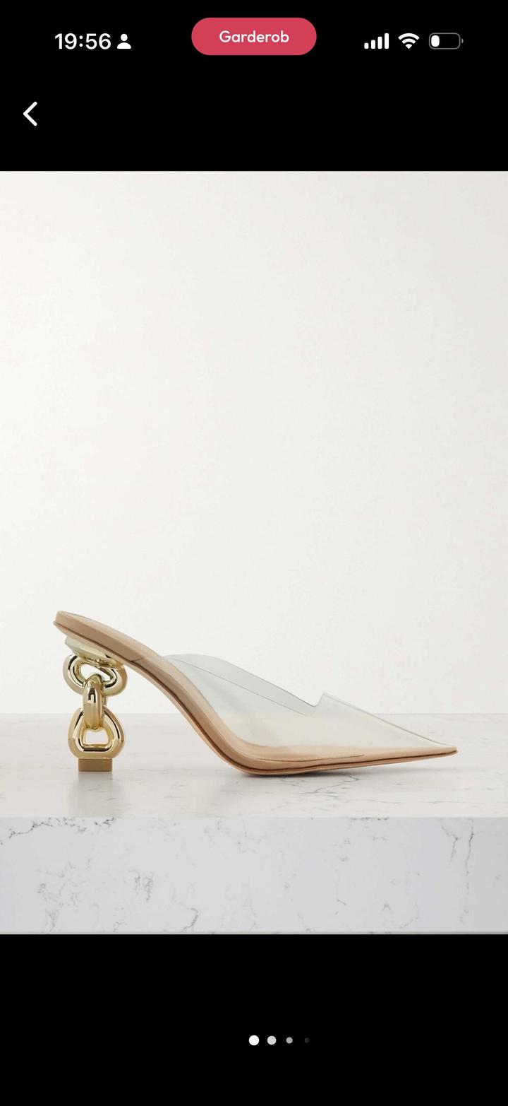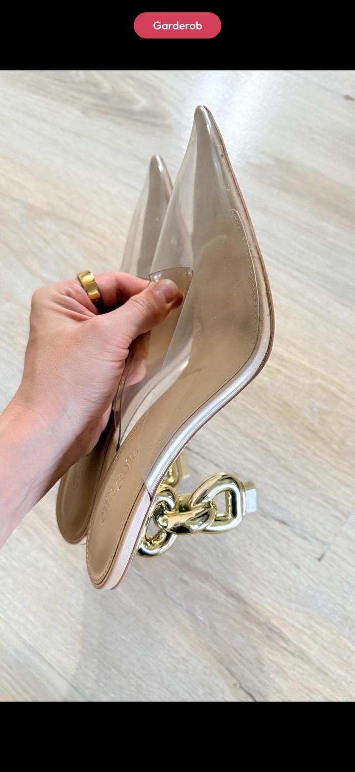 Туфли без задника Carmen на каблуках высотой 80 мм, напоминающих массивные золотые звенья цепи. Они имеют заостренный силуэт из прозрачного ПВХ, который создает эффект удлинения. В комплекте пыльник. В отличном состоянии. Пленка заводская на подошве сохранилась, ее нужно отклеить перед выходом. Оригинал. Приобретала на Net-a-Porte. Артикул: 571136