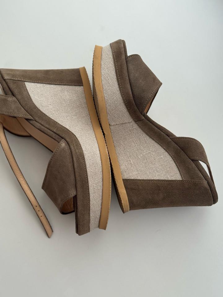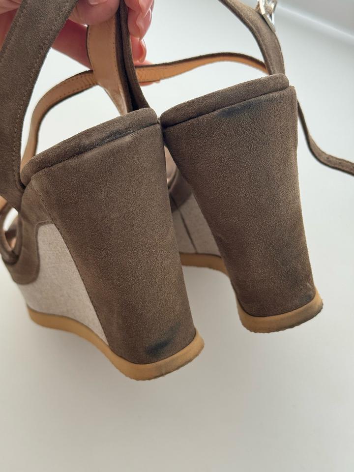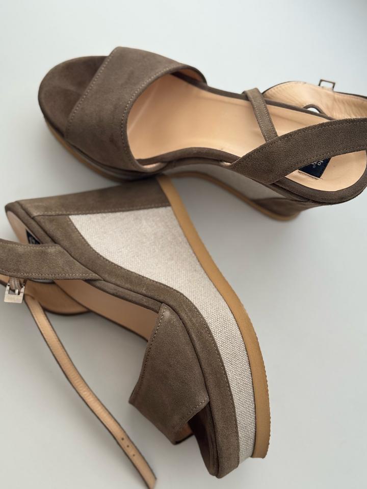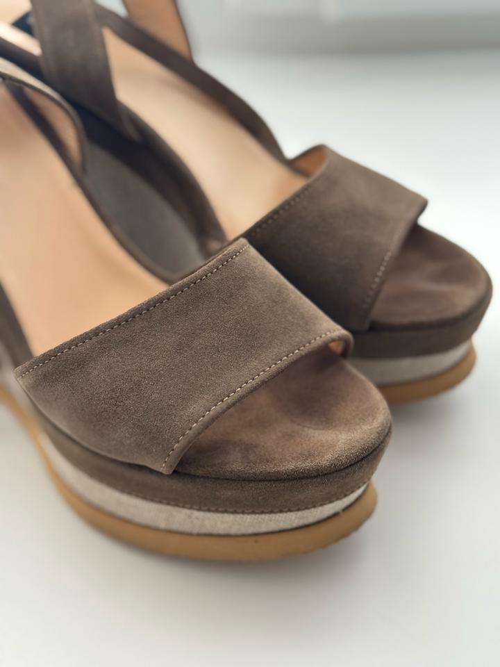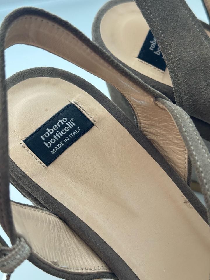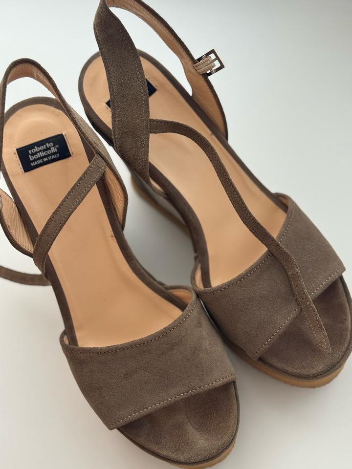 Босоножки от итальянского бренда roberto botticelli. Выполнены из натуральной замши. Платформа 12см. Очень удобные и эффектные босоножки, в хорошем состоянии. Есть следы на задней части от вождения машины (убираются) Артикул: 571163