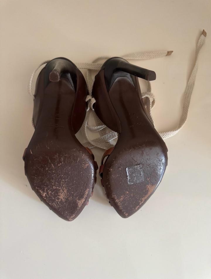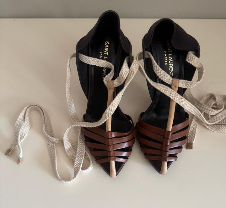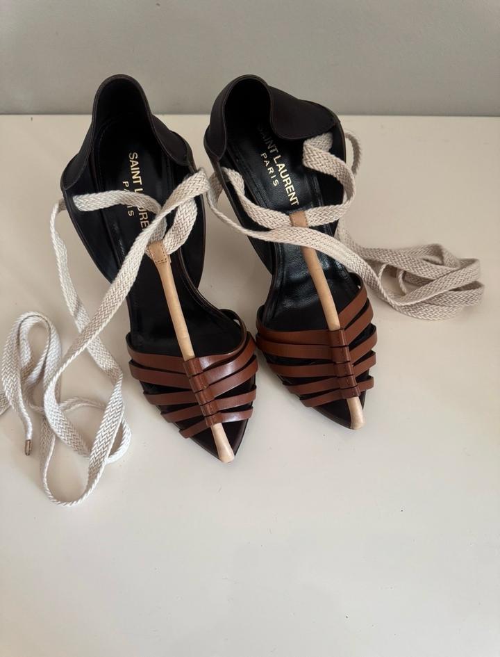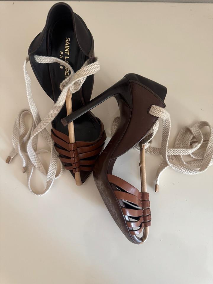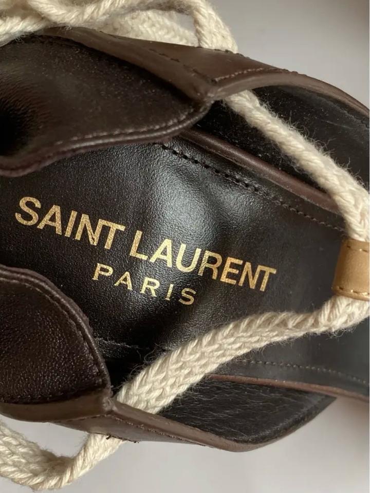 Босоножки Saint Laurent Majorelle 105. Модель была вдохновлена знаменитыми садами Мажорель в Марракеше. Телячья кожа. шпилька высотой примерно 10,5 см Длинные плетеные шнурки кремового цвета, которые оборачиваются вокруг щиколотки и завязываются на бант. Надеты были один раз. Артикул: 571275
