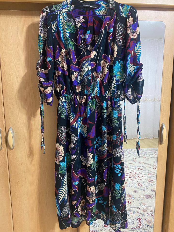 Лёгкое женственное платье с красивым принтом в сине-фиолетовой гамме. Приталенный силуэт с резинкой на талии. Рукава 3/4, V-образный вырез — подчёркивает фигуру. Имеется разрез на подоле. Подойдёт на каждый день, в офис или на выход 🌿 Состояние: отличное Размер: M Длина: миди Ткань: лёгкая, струящаяся Артикул: 571360