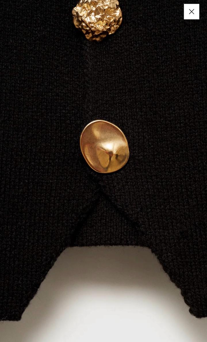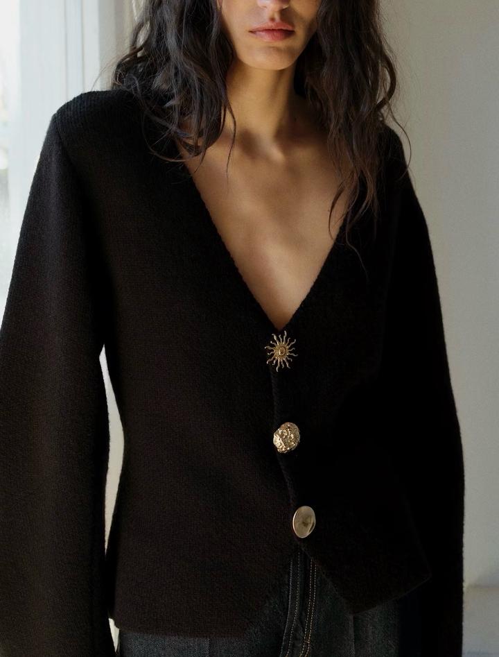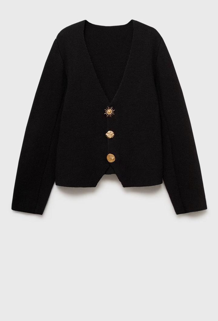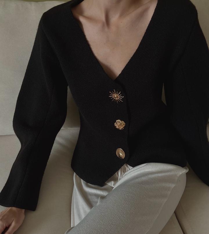 Черный вязаный жакет с акцентными золотыми пуговицами в стиле Schiaparelli Элегантный и структурированный жакет/кардиган глубокого черного цвета, выполненный из плотной, фактурной пряжи. Главная изюминка модели — три разные по дизайну, крупные золотые пуговицы. Этот жакет станет идеальной инвестицией в гардероб в стиле «old money» Артикул: 571482