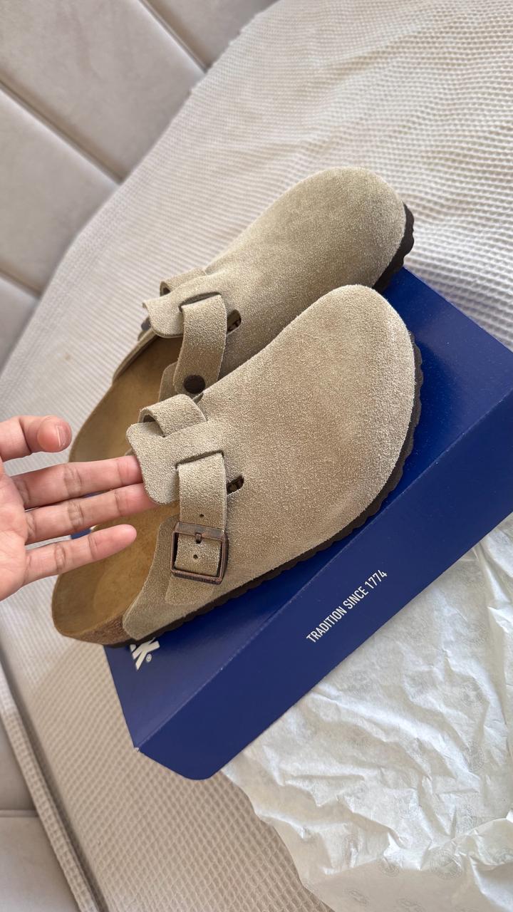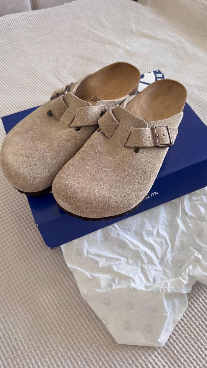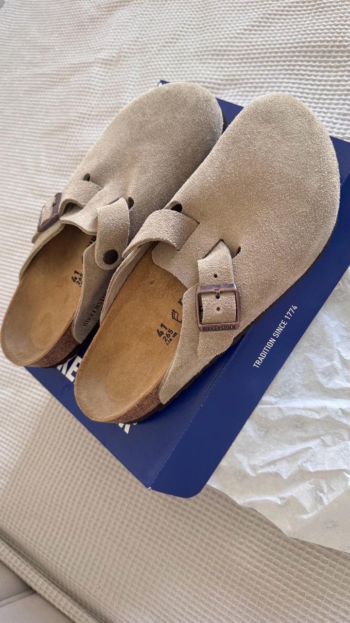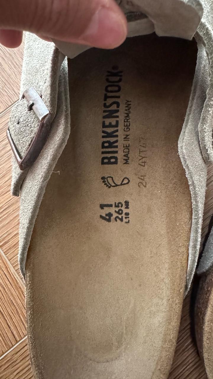 Замшевые слиперы биркеншток (оригинал). Размер 41 (265 мм по стельке). На широкую ногу тоже хорошо подойдет. Заказывала с сайта фарфетч, к сожалению ошиблась с размером. Новые. Артикул: 571643