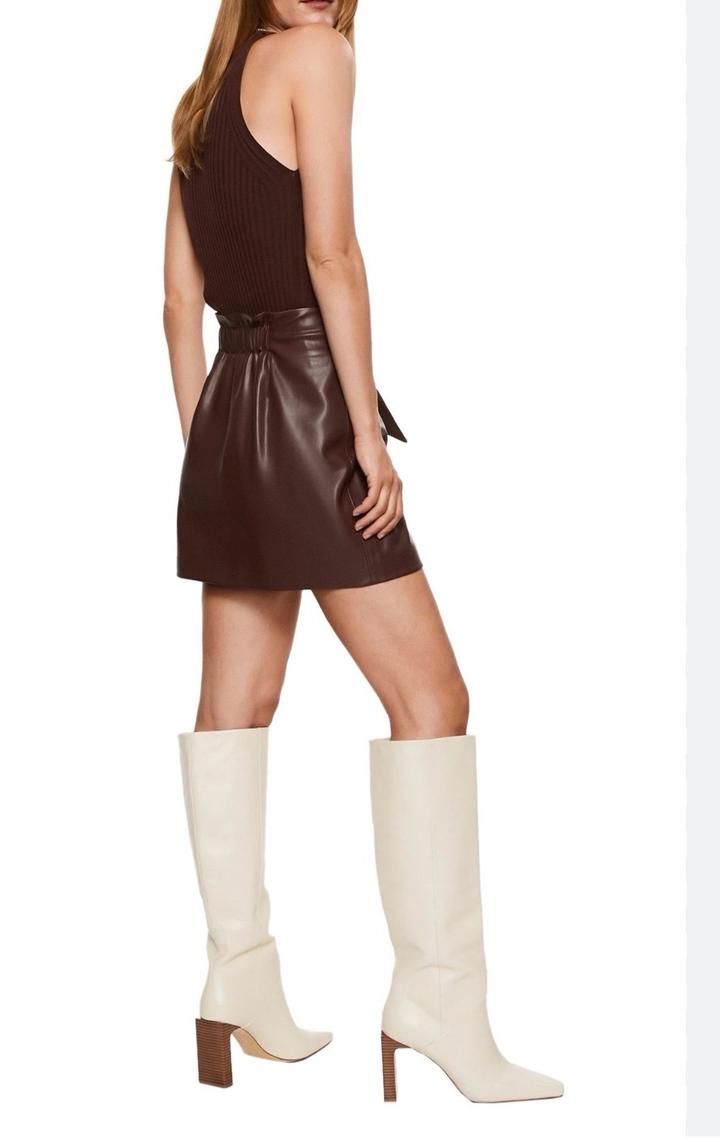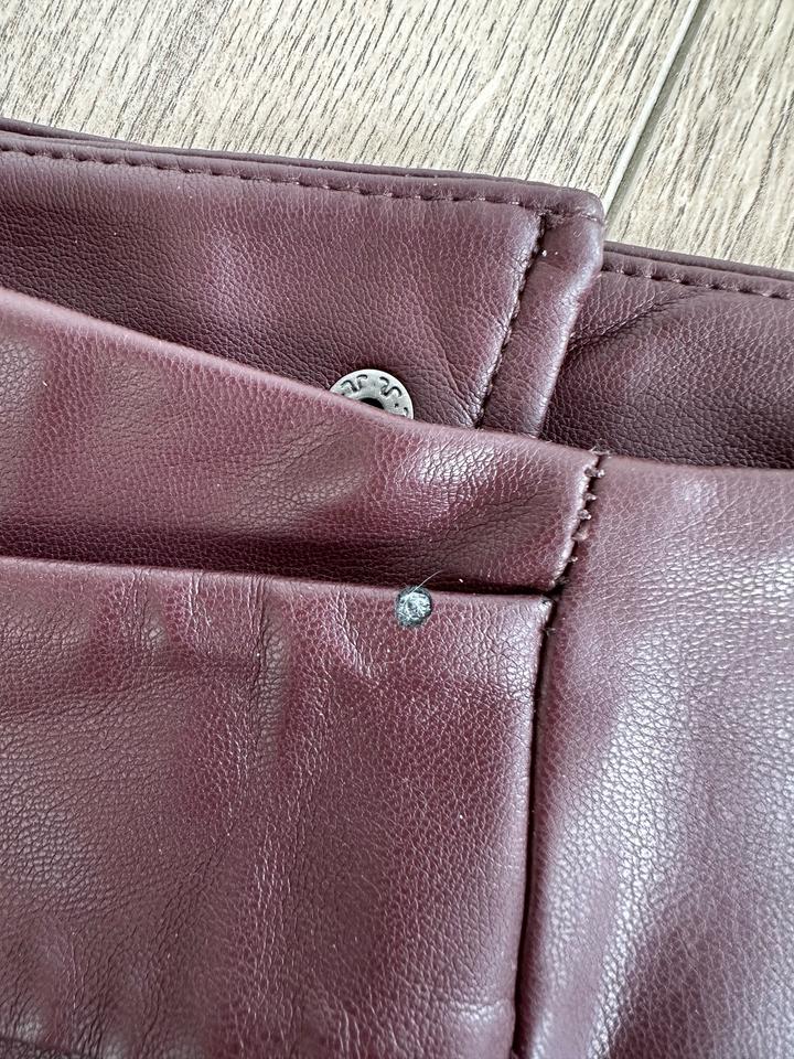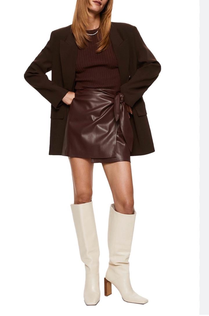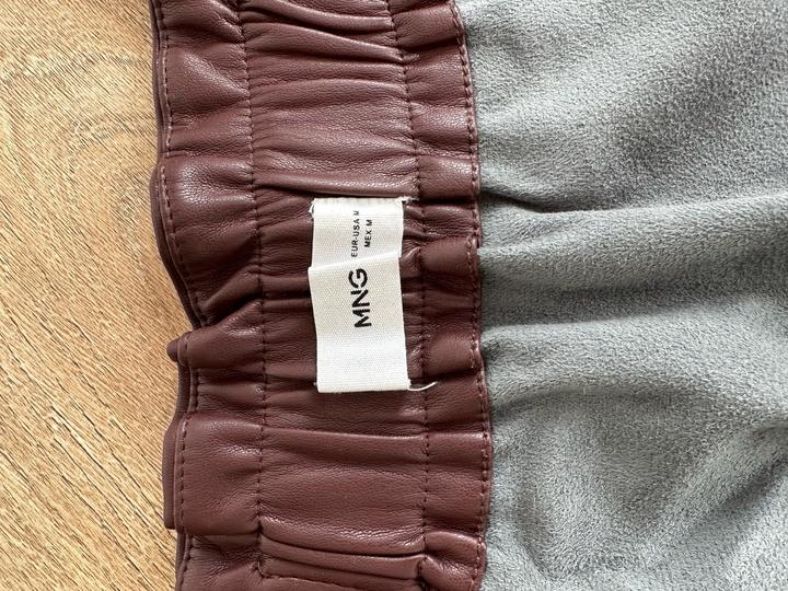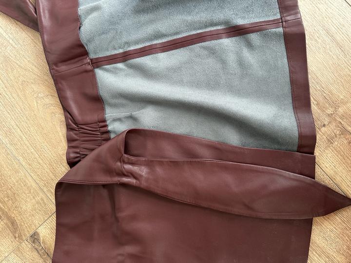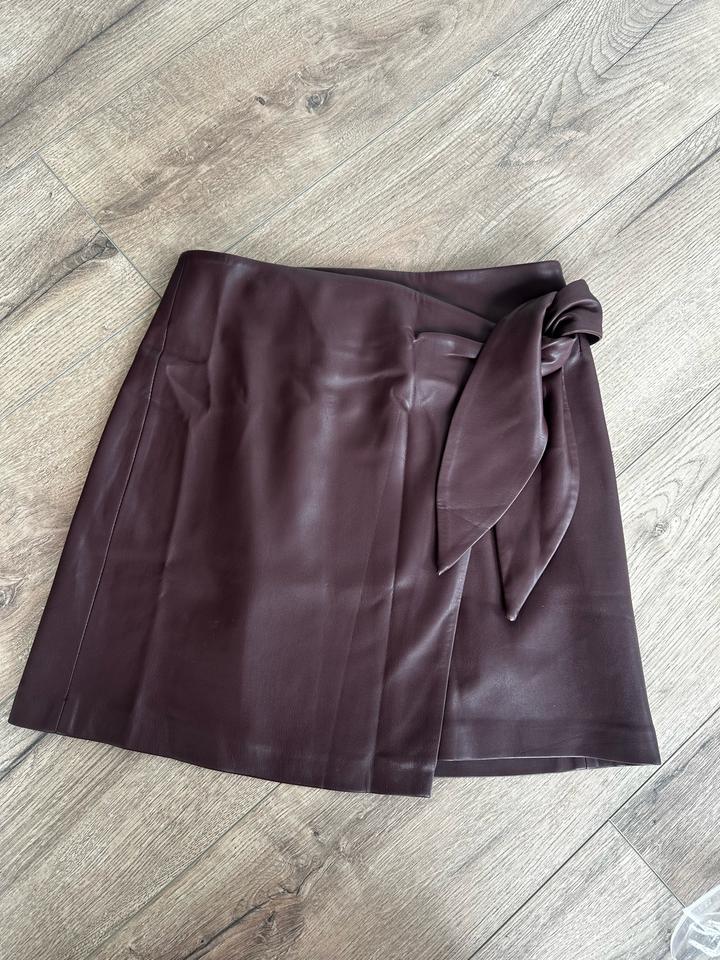 Юбка Mango из искусственной кожи. Прямой крой, средняя талия. Эластичная сборка на спине. Боковая застежка на бант Подходит на размер S, M. С боку на бантике есть небольшой дефект, но он особо не виден. Цвет коричневый, ближе к бордо Артикул: 571821