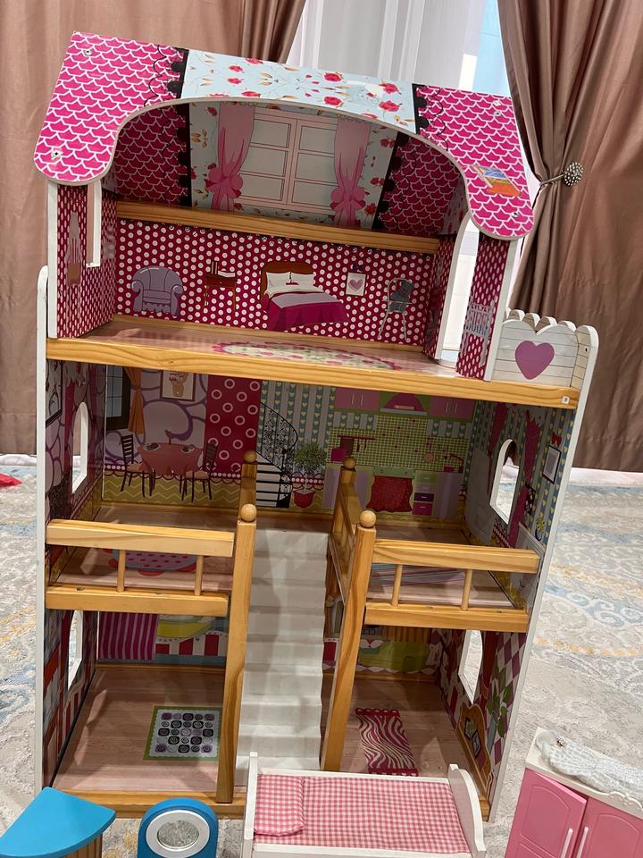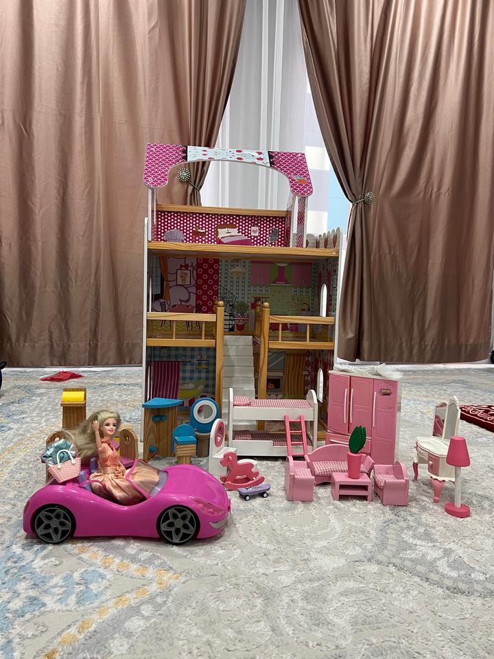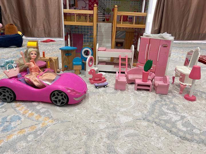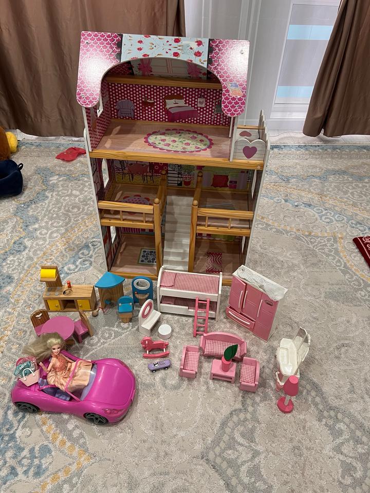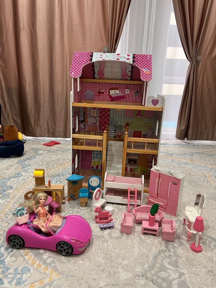 Кукольный домик 3х этажный деревянный,полностью с мелью и с куколй и машинкой Артикул: 571827