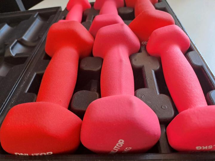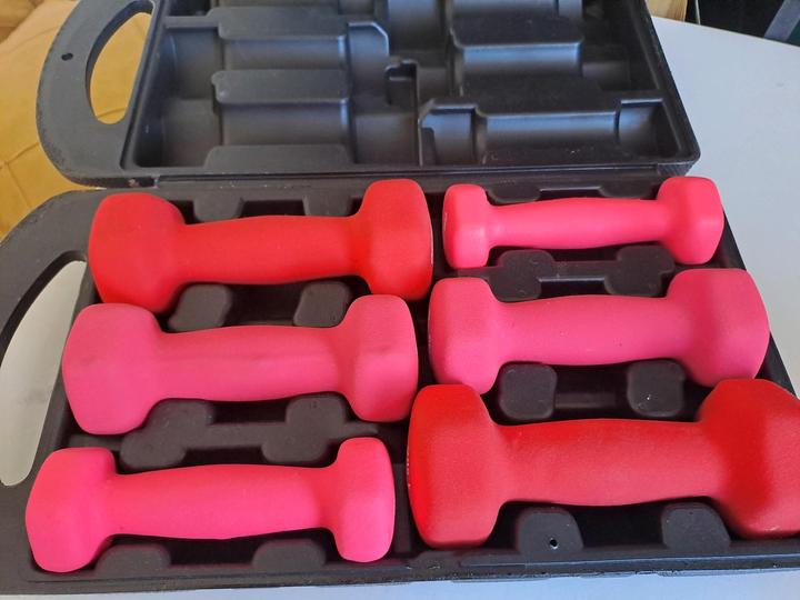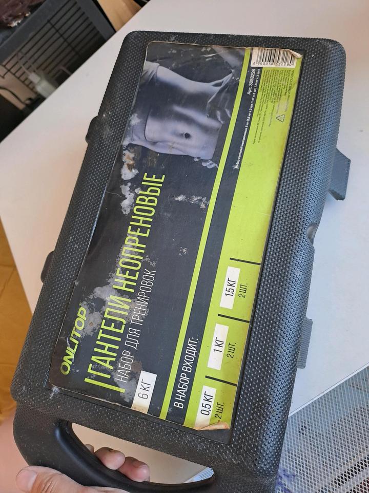 Набор гантелей в кейсе (6 кг) 🔥 Продам удобный набор гантелей для дома — идеально для тренировок, фитнеса и поддержания формы 💪 ✔️ В комплекте: • 0.5 кг — 2 шт • 1 кг — 2 шт • 1.5 кг — 2 шт ✔️ Общий вес: 6 кг ✔️ Удобный кейс для хранения и переноски ✔️ Приятное неопреновое покрытие — не скользят в руках Состояние: хорошее, полностью готово к использованию Артикул: 572058