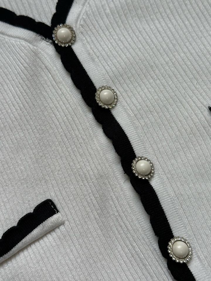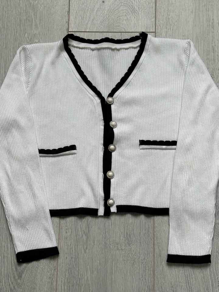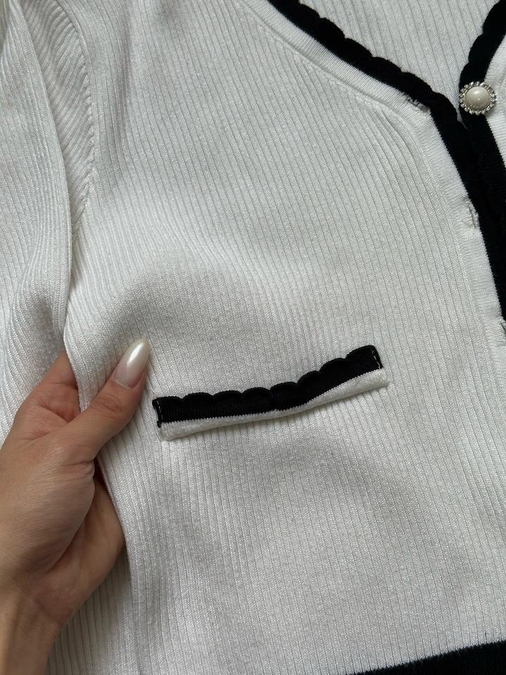 Красивая белая кофта, аккуратная, базовая, но смотрится очень стильно за счёт чёрной окантовки и пуговиц. Ткань мягкая, приятная к телу, хорошо тянется. Отлично подходит как на повседневку. Надевала 1–2 раза, состояние очень хорошее. Размер S ( на XS тоже подойдет) Лучше подойдёт на рост 155–158 (на мой 162 рукава немного коротковаты) Есть маленький нюанс: на одной пуговице отпала одна страза, но в жизни это вообще не заметно. Артикул: 572225