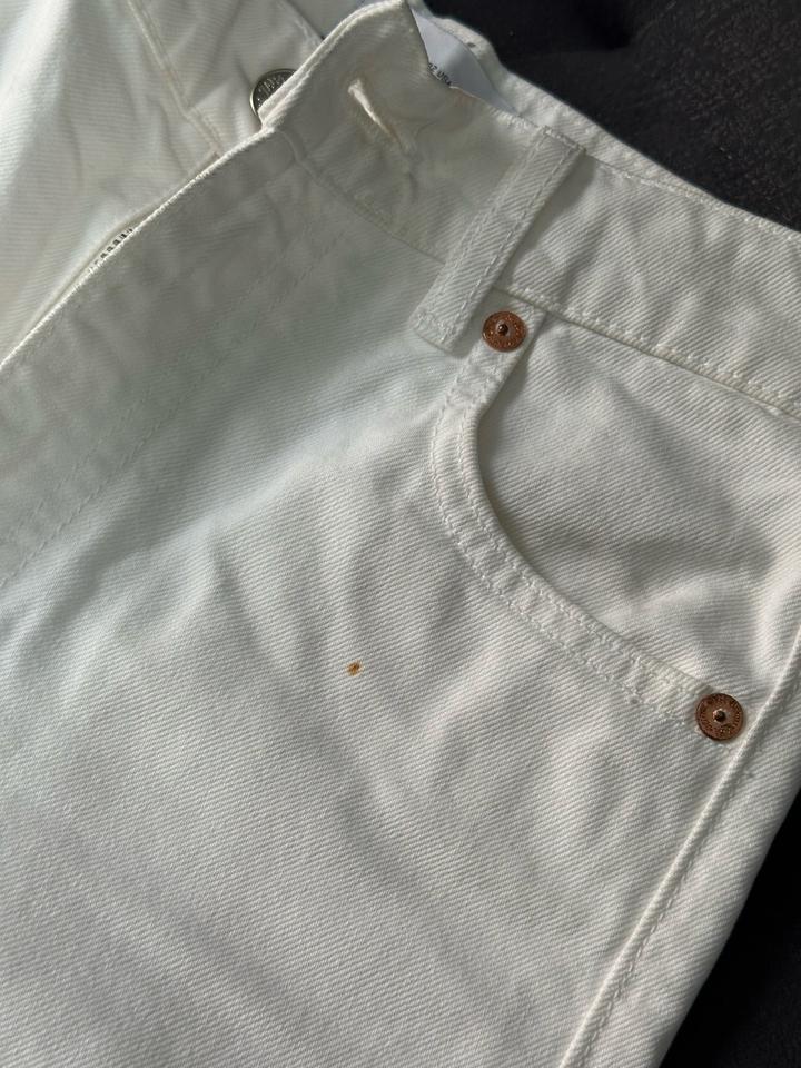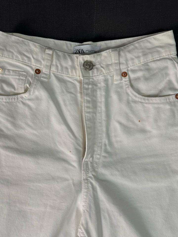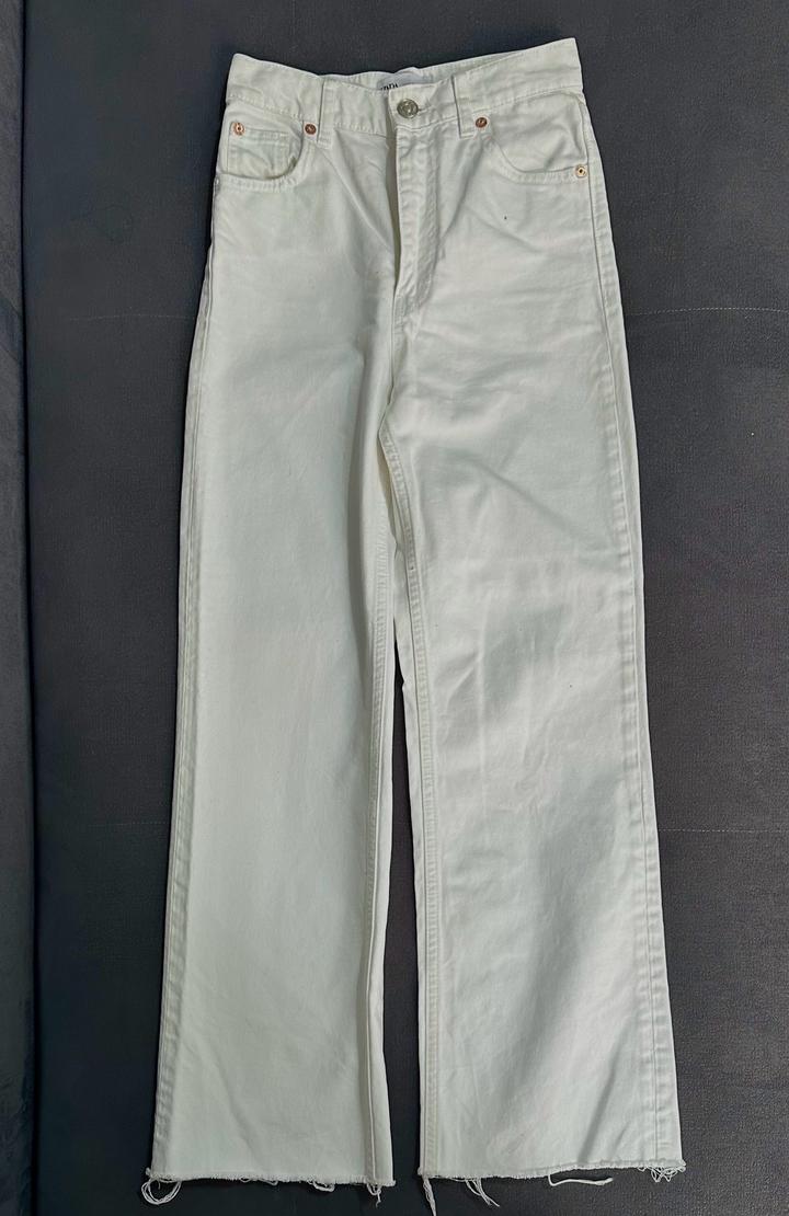 Белые джинсы Zara прямого кроя с высокой посадкой Ткань плотная Размер XS Подойдут на рост от 156 до 160 Лучше сядут на узкие или средние бёдра, на широких могут немного давить Есть небольшие пятна, но не сильно заметны в носке. Думаю, можно вывести, просто сама не пробовала Сидят аккуратно. Артикул: 572302