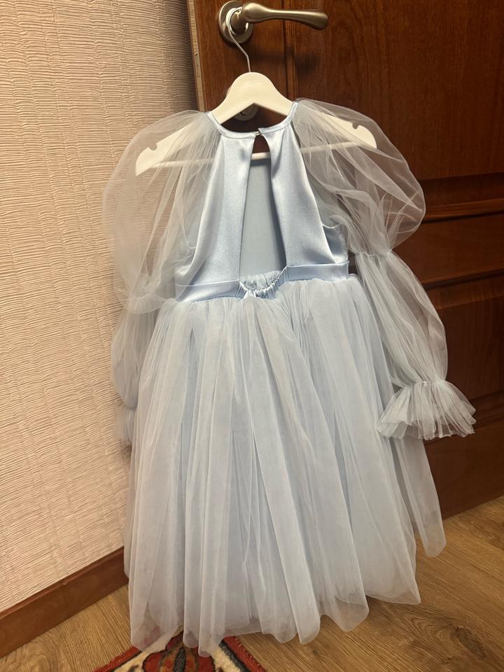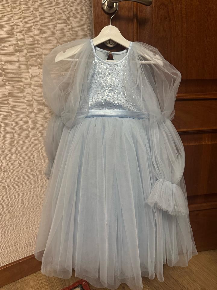 Голубое платье, есть сзади 1 пуговица, спина открытая. Одевалась 2 раза совершенно. На 4 года 104-110 размер Артикул: 572472