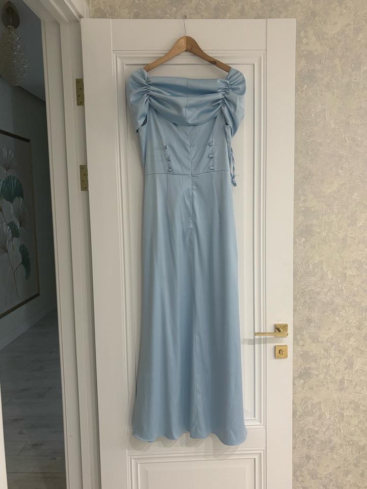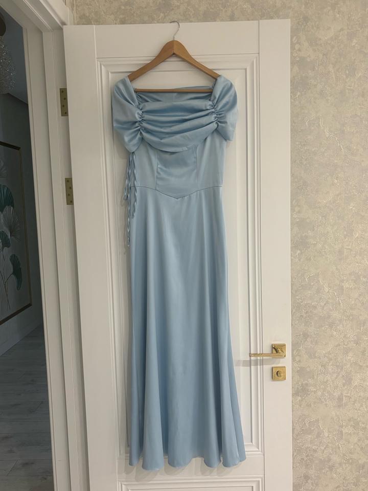 Небесно-голубое платье, длина макси, материал:шелк. На завязках,поэтому регулируется на любую фигуру. Размер-М Артикул: 572490