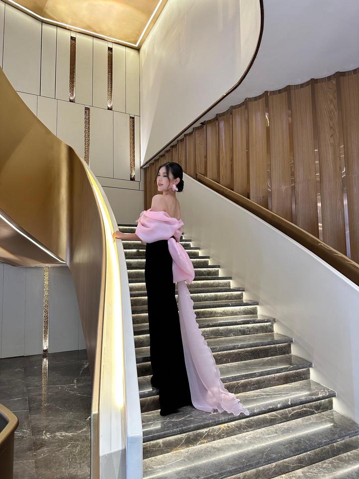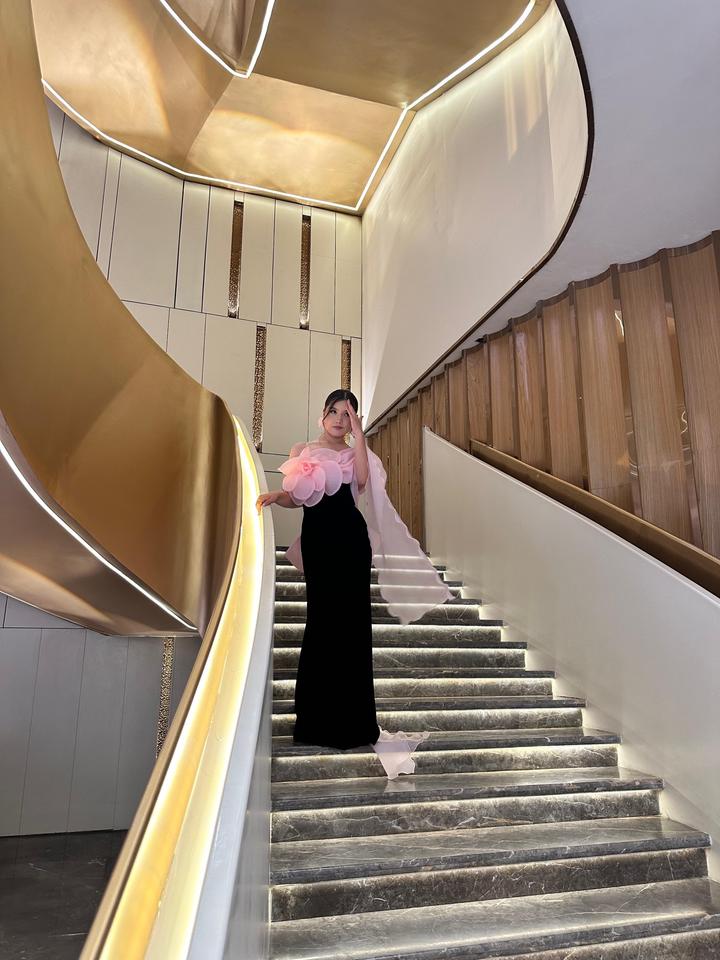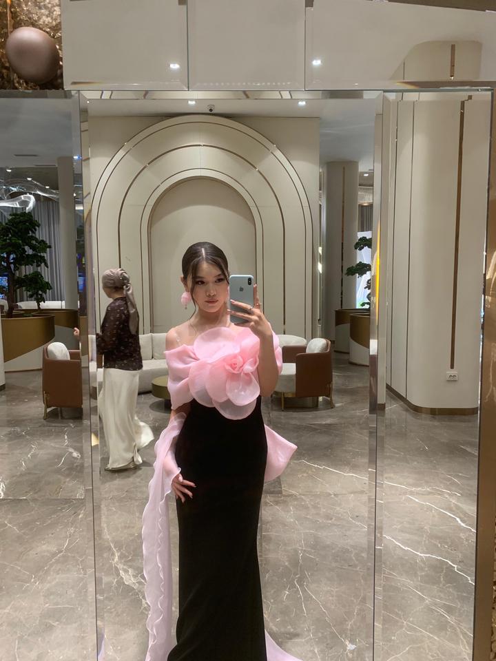 Вечернее дизайнерское платье в идеальном состоянии — надето всего один раз на торжество. Элегантное сочетание чёрного и нежно-розового цветов создаёт изысканный и запоминающийся образ. Главный акцент — объёмный цветок из лёгкой органзы в зоне декольте, который придаёт образу нежность и роскошь. Приталенный силуэт красиво подчёркивает фигуру, а асимметричные детали добавляют современности. Артикул: 572526