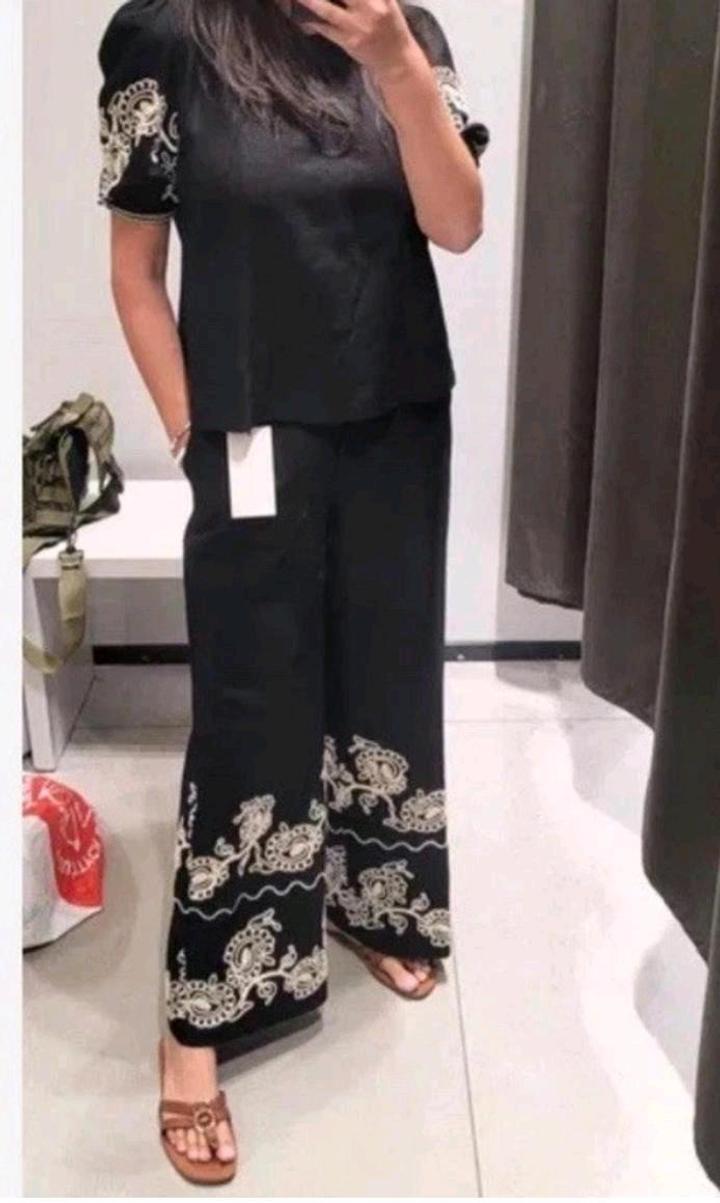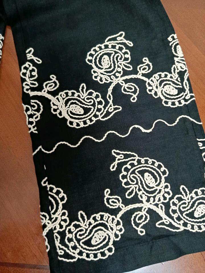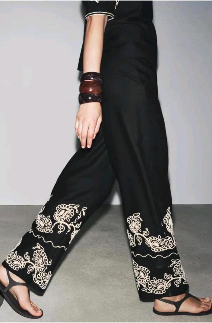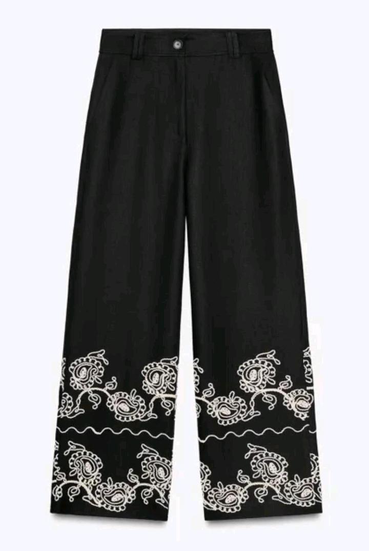 Брюки со средней посадкой изо льна и вискозы,размер S .Не одевала .Состояние новое .Боковые карманы,снизу контрастная вышивка. Состав:83% лён, 17 % вискоза Артикул: 572941