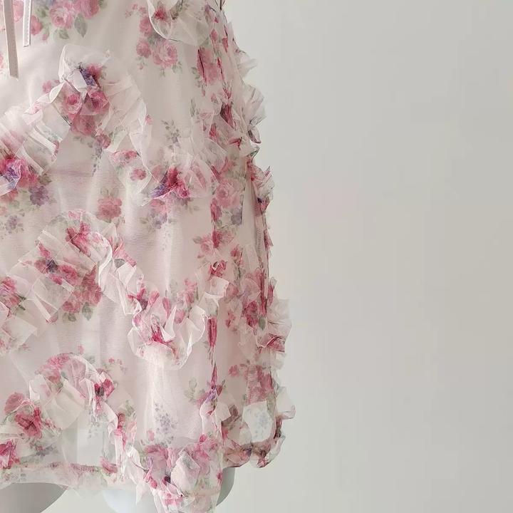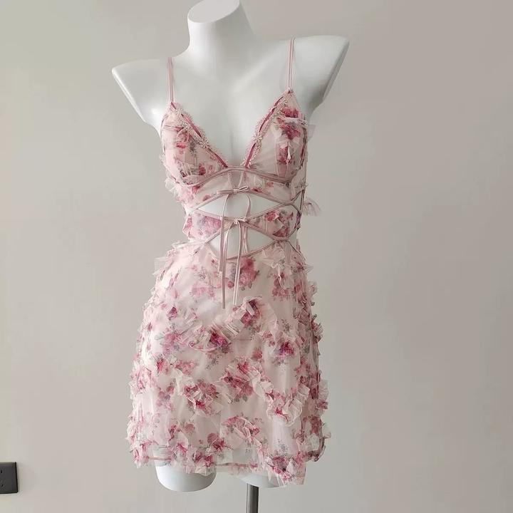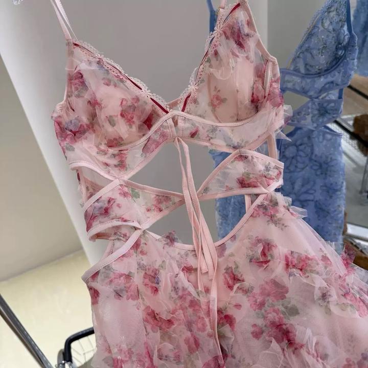 Лёгкое и женственное платье с романтичным цветочным принтом. Выполнено из воздушной ткани с декоративными рюшами и шнуровкой на талии, которая красиво подчёркивает фигуру. Тонкие бретели и открытая спина добавляют образу нежности и изящества. Артикул: 573110