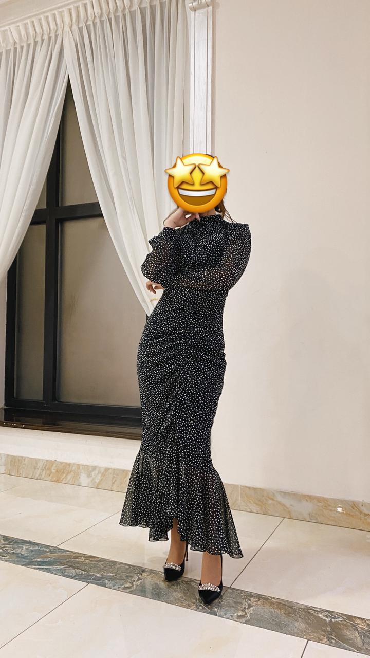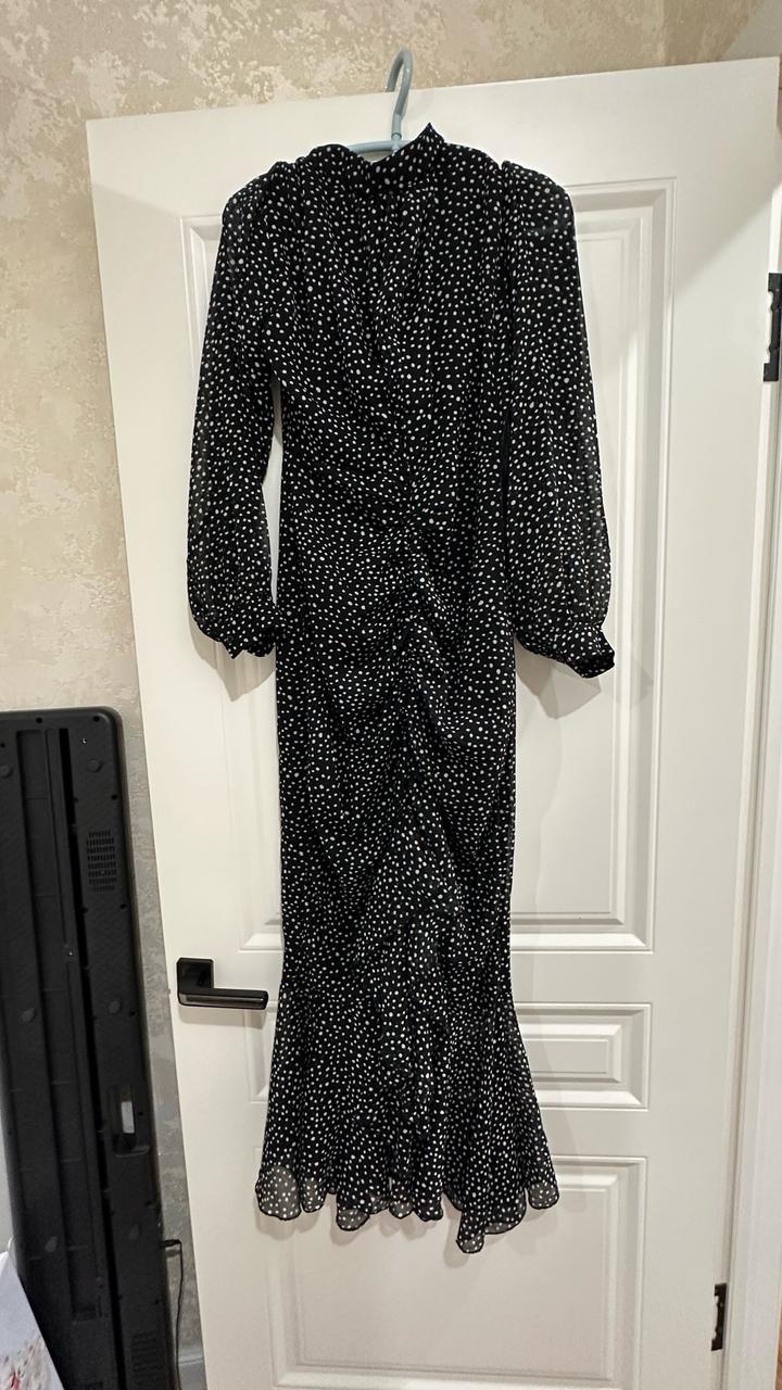 Черное шифоновое платье в белый мелкий горошек, с подкладом. Идеально сидит по фигуре и выделяет талию. На фото рост 164 см Артикул: 573187