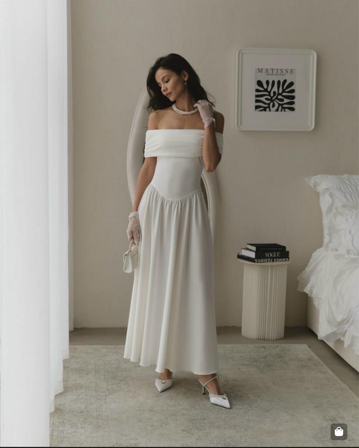 Белое платье макси с открытыми плечами.L