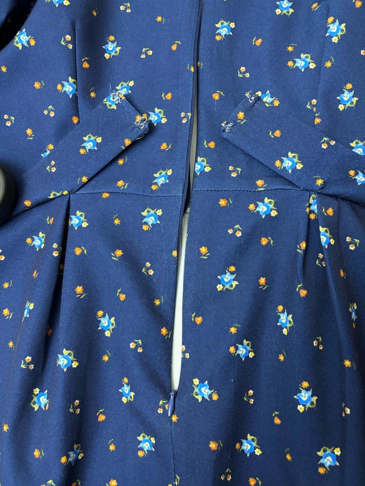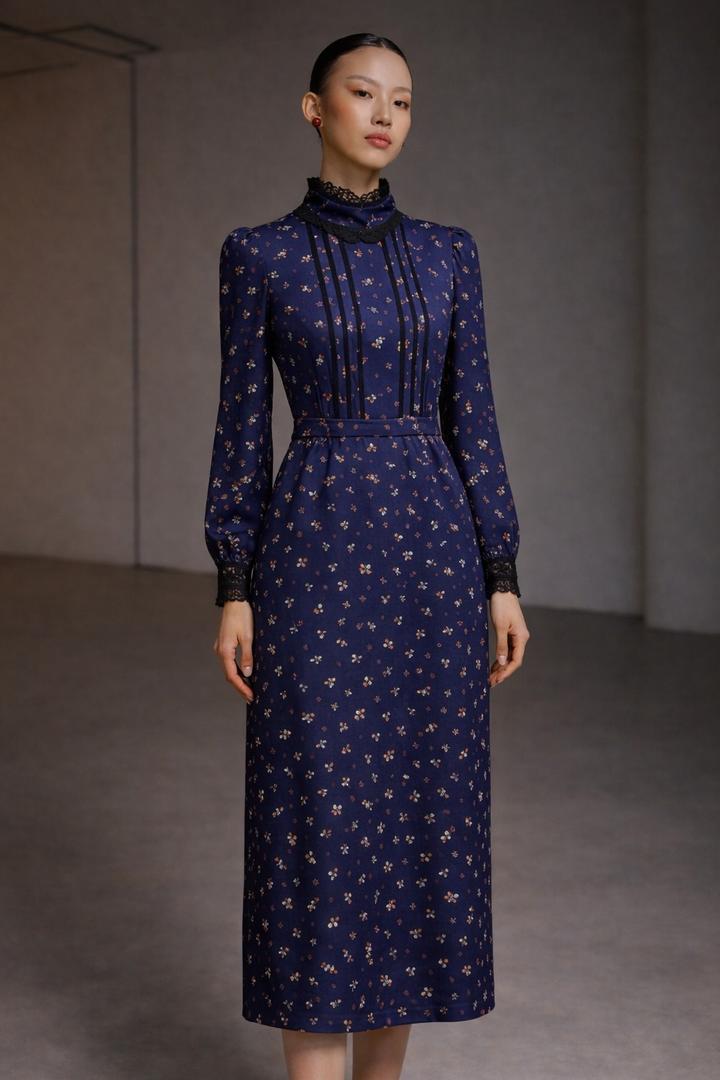 Не винтаж! Элегантное платье глубокого синего оттенка с деликатным цветочным принтом. Приталенный силуэт, высокий ворот с кружевной отделкой и удлинённые рукава с манжетом. Обьем по талии 80 см. Состояние👌 вышло на одно мероприятие. Артикул: 573633