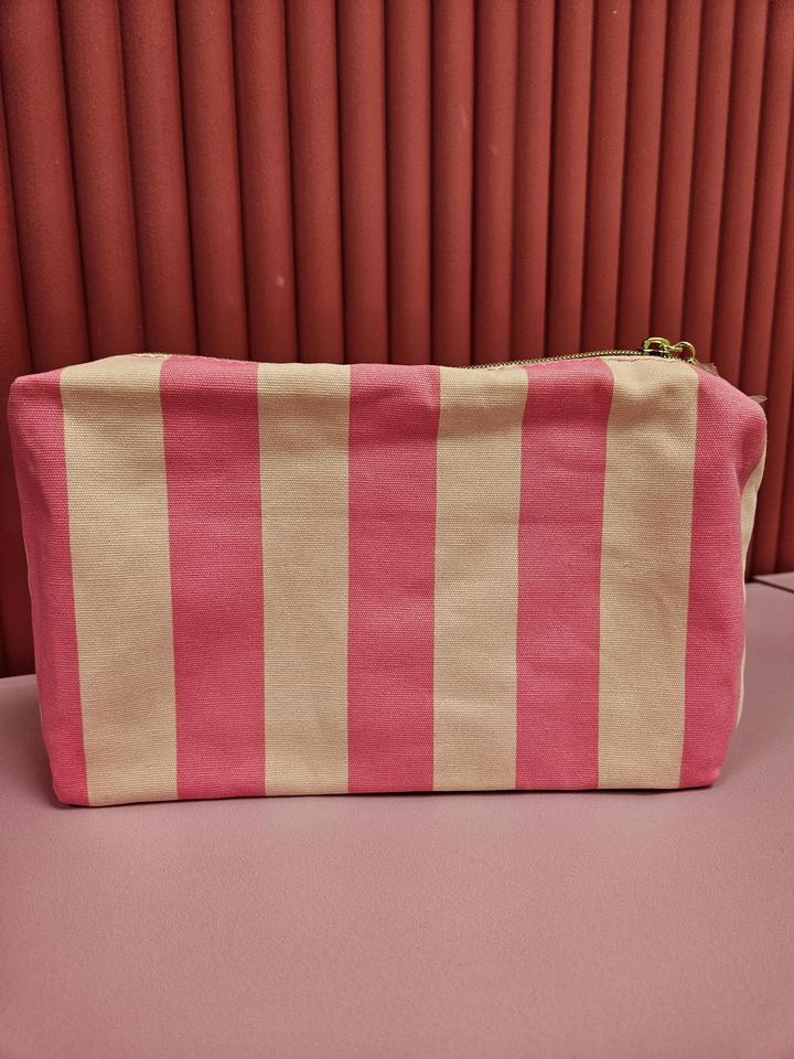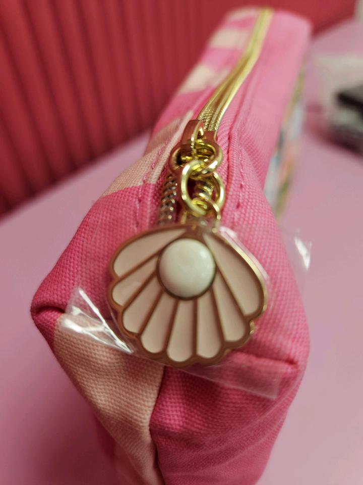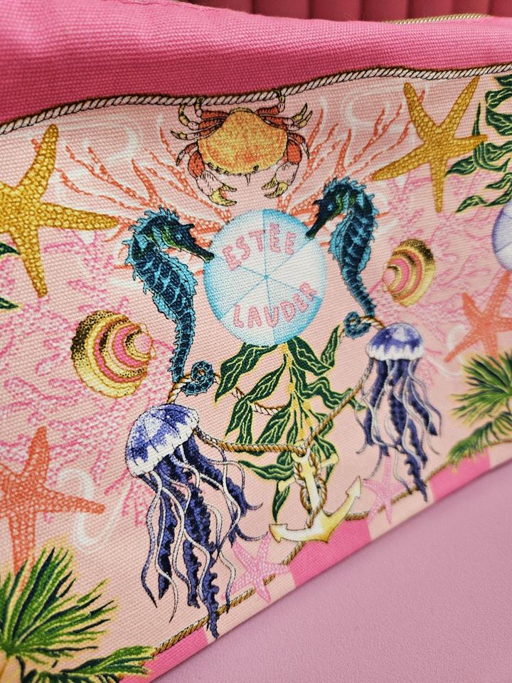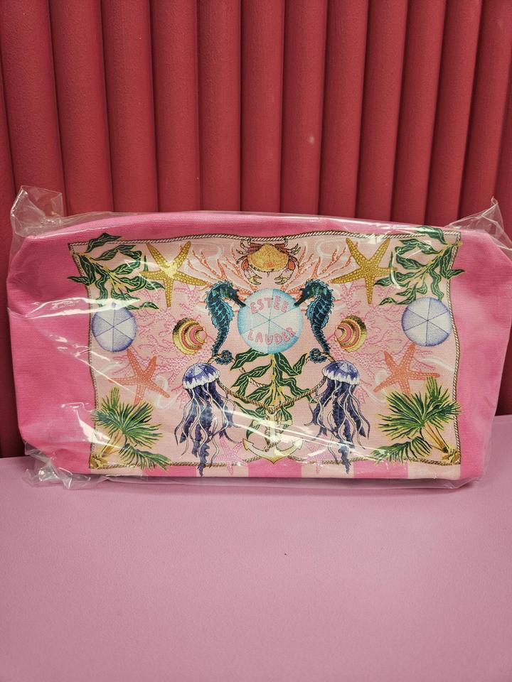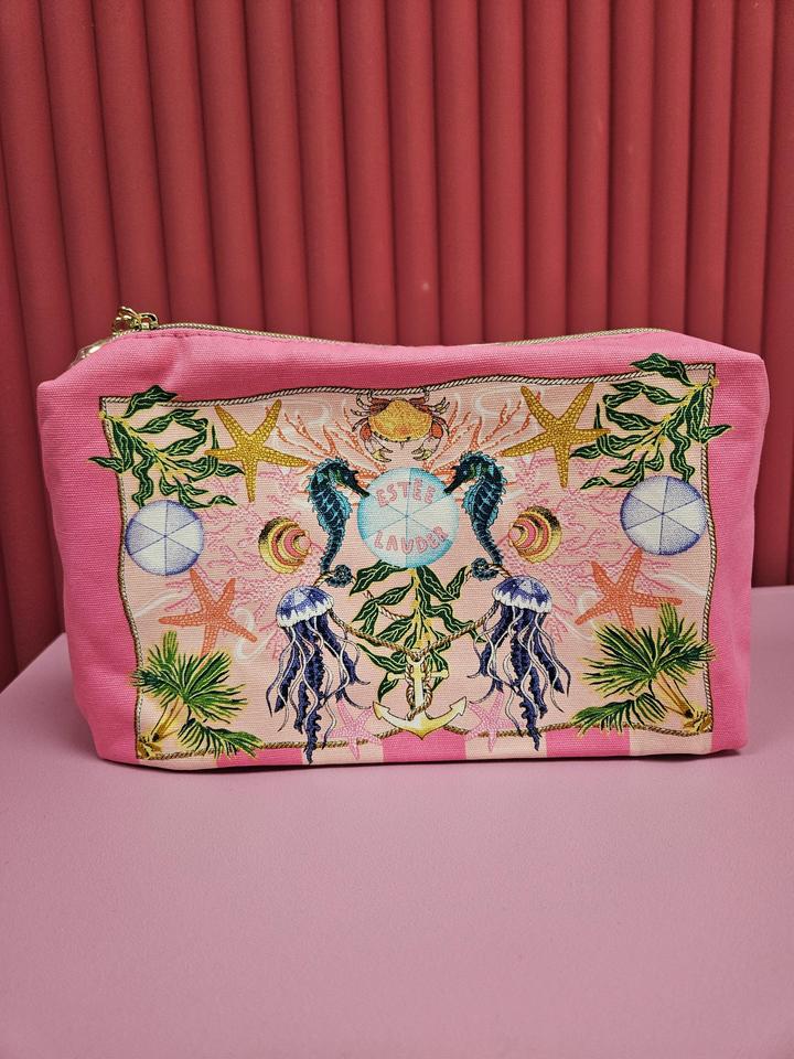 Элегантная косметичка из мягкой хлопковой ткани в насыщенном розовом оттенке. Одна сторона украшена изысканным морским принтом с морскими коньками, медузами, звёздами и центральным гербом Estée Lauder. Вторая сторона выполнена в нежной розово-кремовой полоске, создающей утончённое летнее настроение. Особый шарм придаёт золотая молния с изящным подвеском в виде ракушки. Артикул: 573650