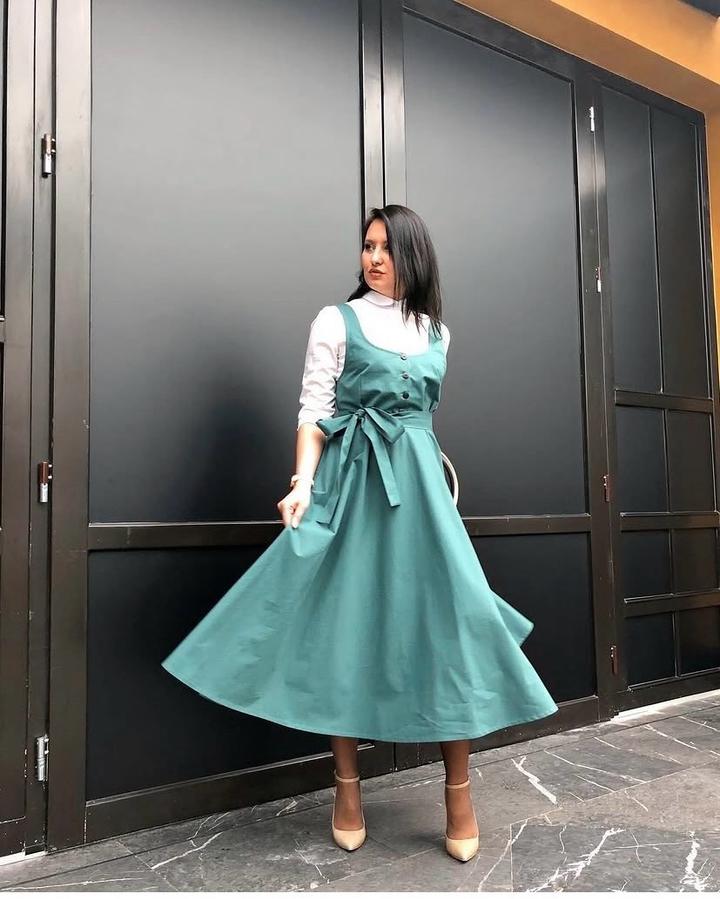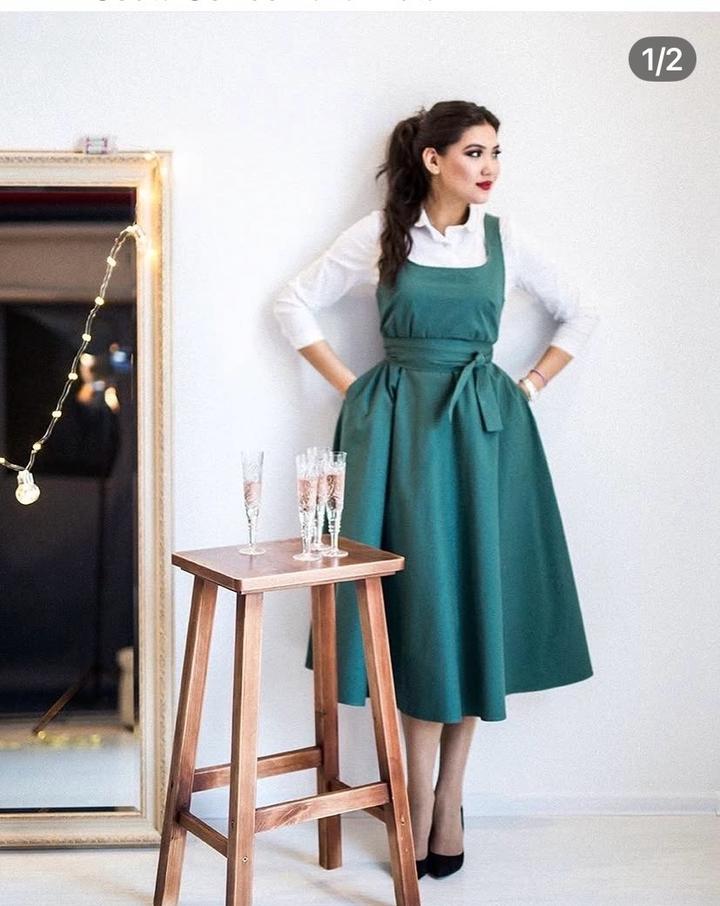 Сарафан из 100% хлопка, плотная ткань, которая держит форму. Размер М. регулирующиеся сзади лямочки, на спине на поясе резиночка, глубокие карманы. Одето было один раз. Артикул: 573818