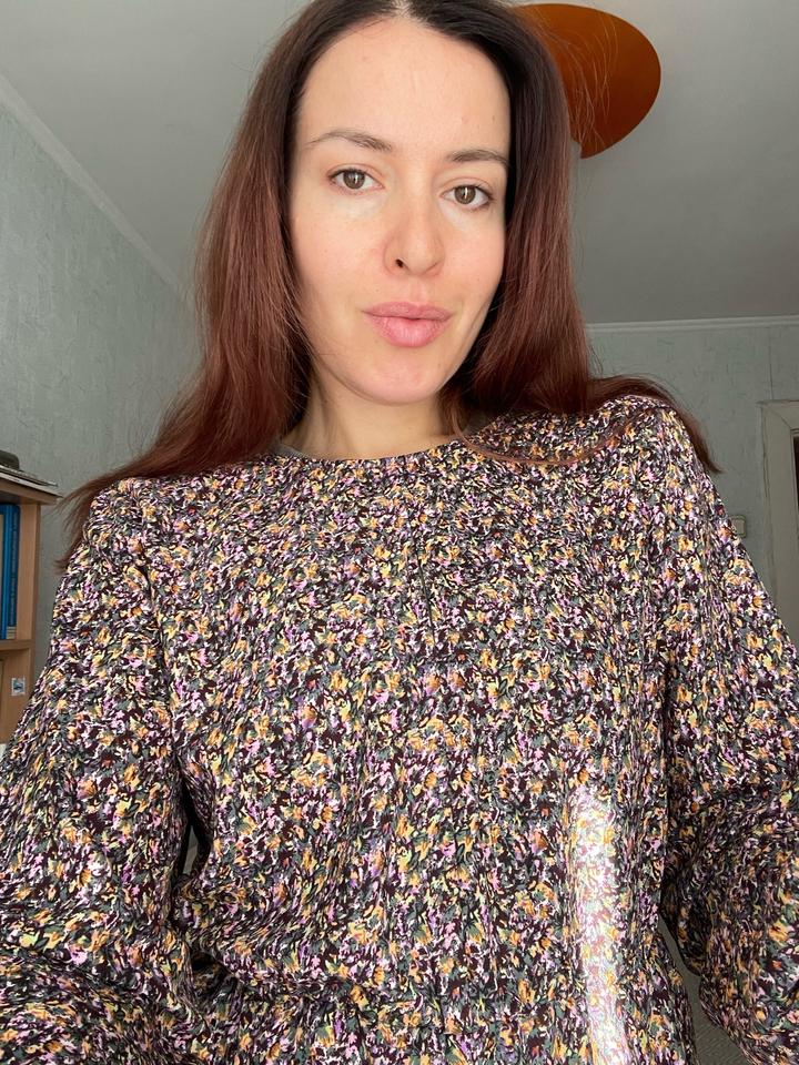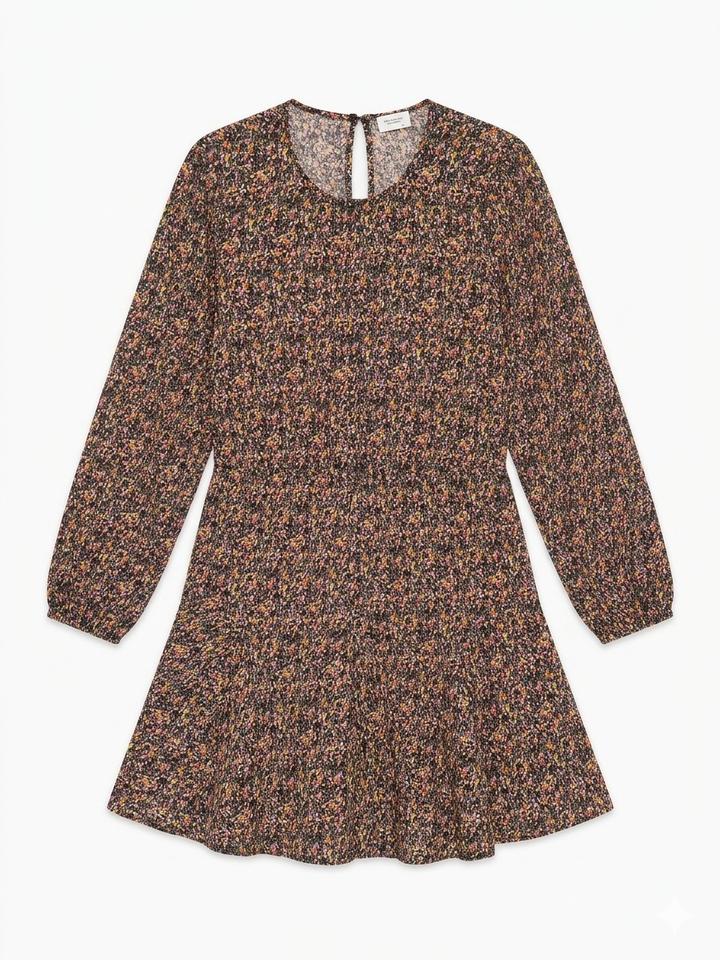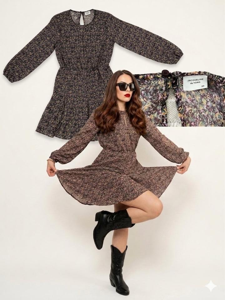 Очаровательное короткое платье с длинными рукавами от бренда (Jacqueline de Yong), размер 40. Это модель — идеальное воплощение стиля «дикий цветочный принт» (ditsy floral). Платье выполнено из легкой ткани с густым, мелким и изящным узором из разноцветных цветов на темном фоне. Такой принт создает непринужденный, женственный и немного винтажный образ. М-L Длинные объемные рукава, приталенный силуэт с отрезной талией, переходящий в пышную расклешенную юбку со сборами, что придает образу легкости Артикул: 574179