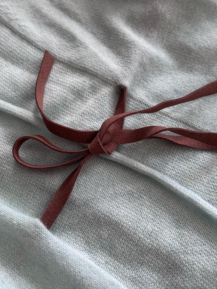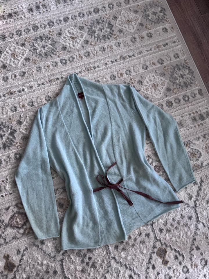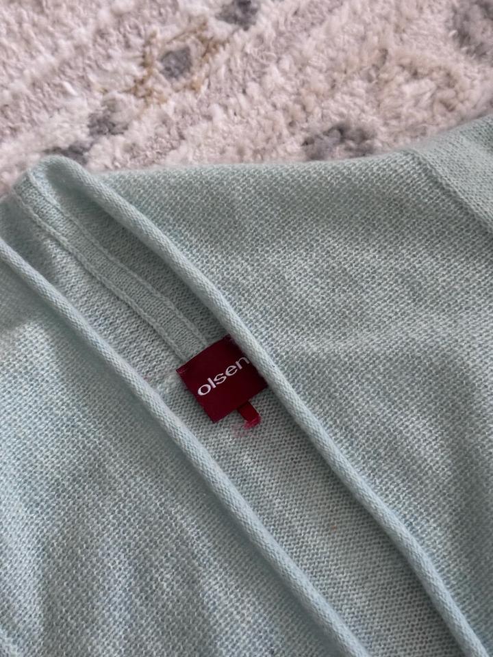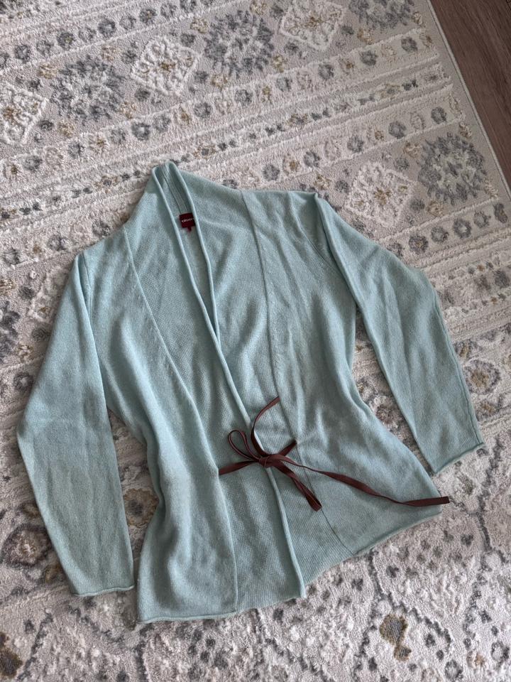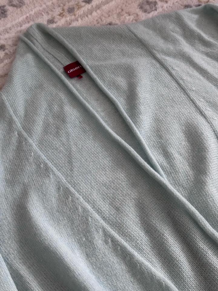 Модель: открытый кардиган без пуговиц, с запахом (wrap-style) и завязками на поясе (tie belt / завязывающийся пояс в тон). • Цвет: светлый мятный / пыльно-мятный / sage green (очень нежный и актуальный оттенок). • Материал: тонкий, мягкий трикотаж (скорее всего, смесь вискозы, полиамида и эластана или с добавлением шерсти/ангоры — типично для Olsen, приятный к телу, хорошо драпируется). • Крой: V-образный глубокий вырез, длинные рукава, приталенный силуэт благодаря поясу. Длина — до середины Артикул: 574181