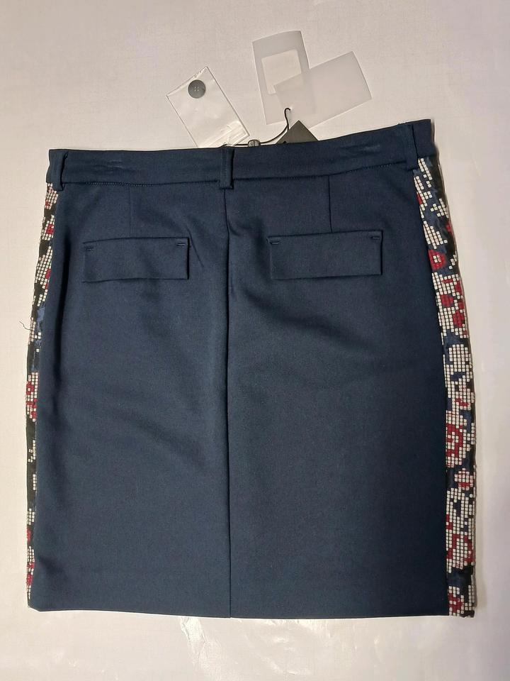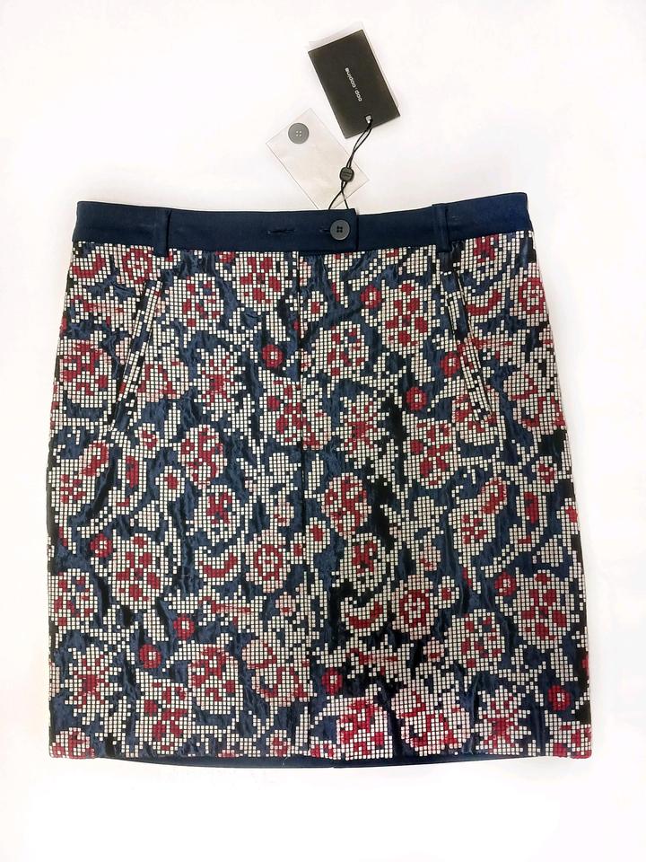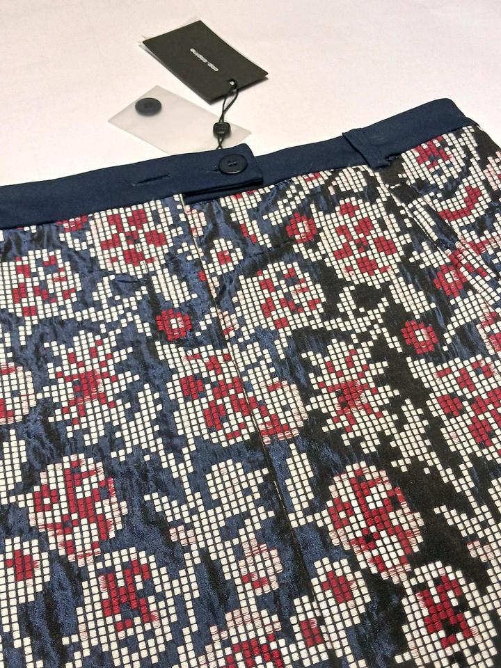 Стильная тёмно-синяя юбка с жаккардовым узором — выглядит дорого и аккуратно, отлично держит форму и красиво сидит по фигуре. Размер: 36 (XS–S) Производство: Португалия Состав: Основная ткань (перед): 66% хлопок, 20% полиэстер, 10% ацетат, 4% др. волокна Задняя часть: 5+7### ### ## ##й эластичностью — комфортная в носке и хорошо держит форму. Артикул: 574221