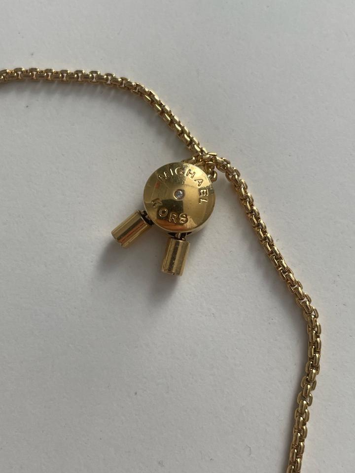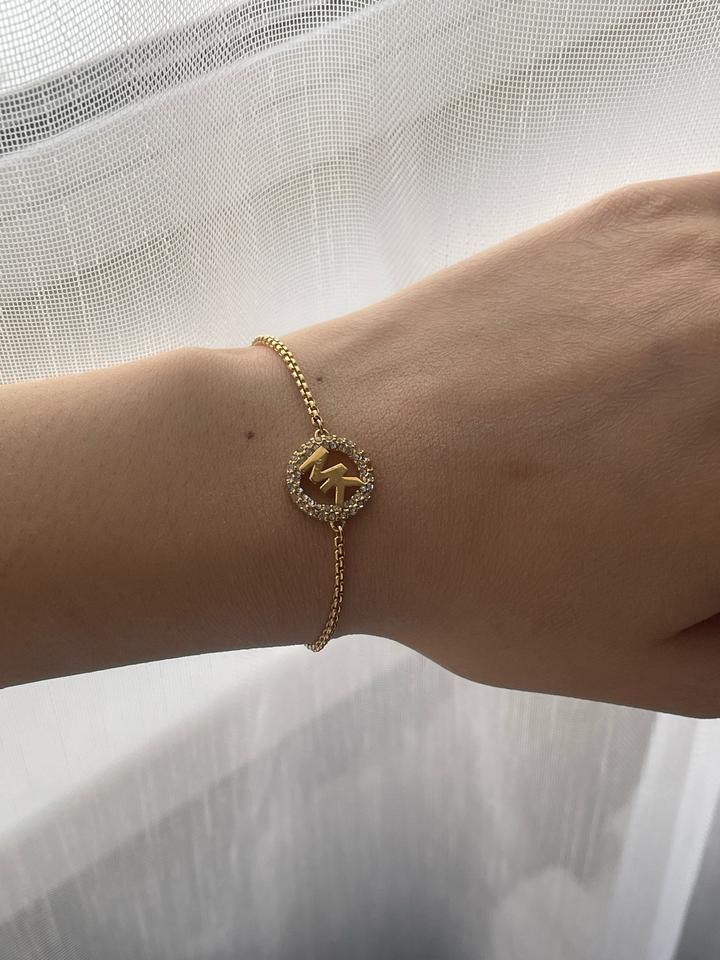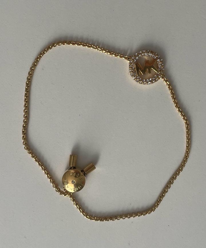 Оригинальный комплект Michael Kors: браслет с фирменным логотипом MK. Стильный золотой оттенок, аккуратные камни, смотрится дорого и минималистично. Браслет с удобной регулируемой застёжкой (slider), подходит на любой размер. Серьги лёгкие, комфортные в носке. Состояние хорошее. Есть незначительные следы носки: маленькая царапина и отсутствует один камень на браслете (в носке практически не заметно). Артикул: 574338