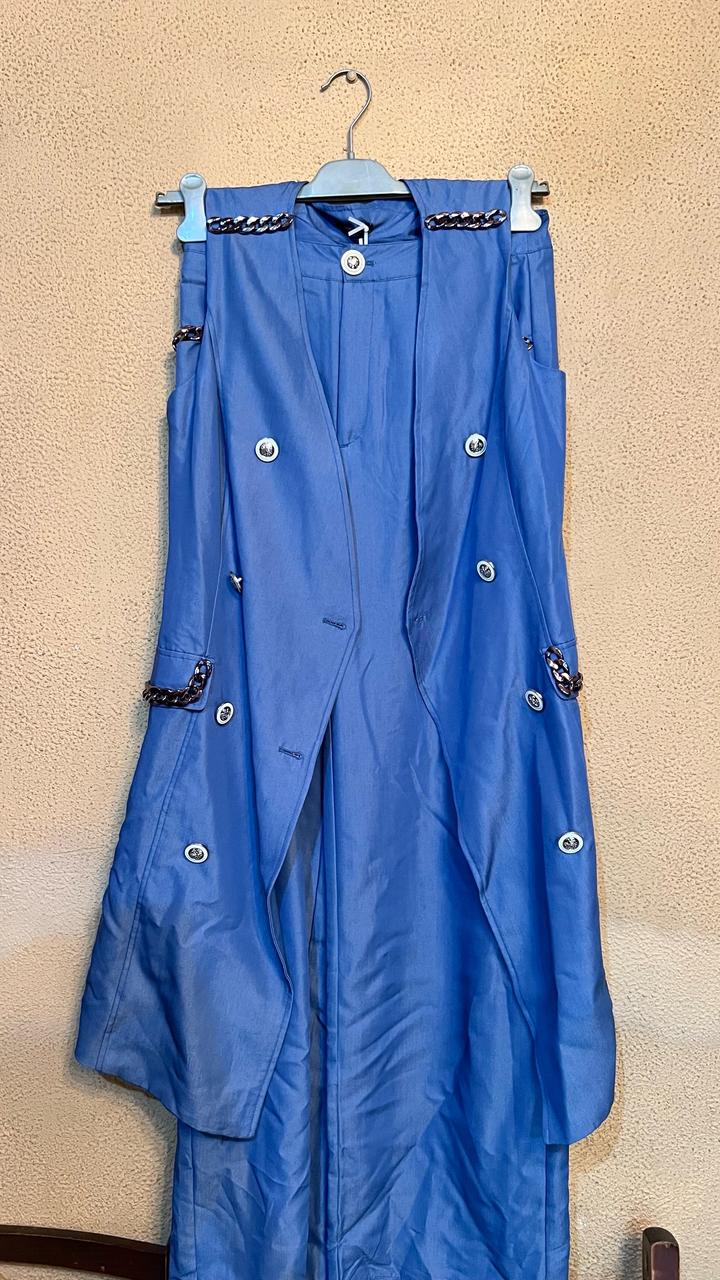 Костюм двойка, приятный гладкий материал. Голубой цвет с розово-лиловым отливом Размер жилетки 46 Брюки 46 Артикул: 574672