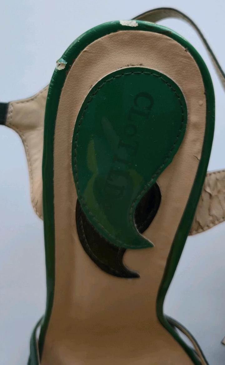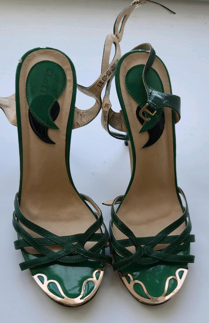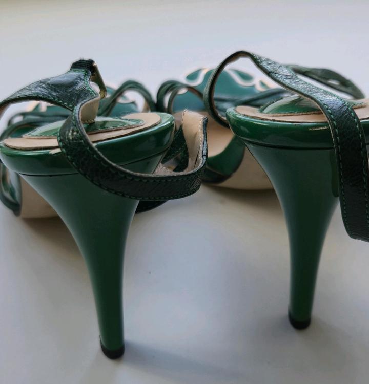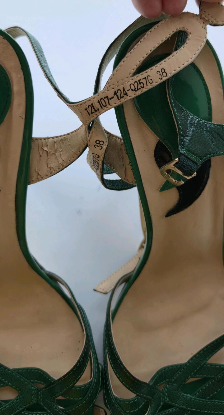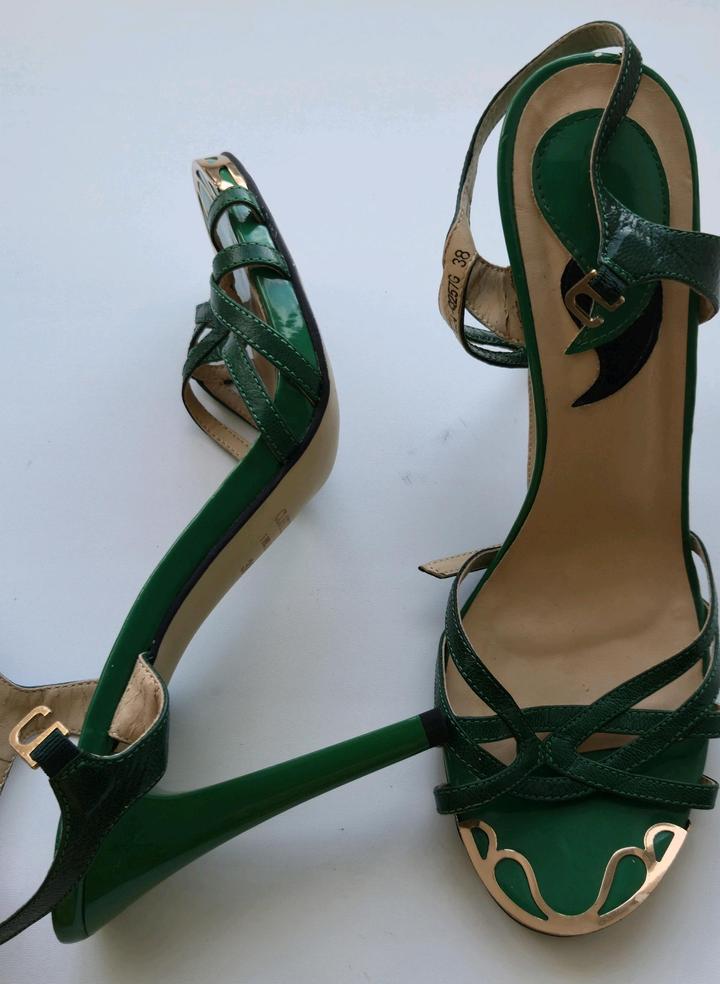 Босоножки на шпильке, зеленого цвета, 38 размер, есть не большой дефект на ремешках и на пятке (на фото), но при носке особо не видно Артикул: 574704