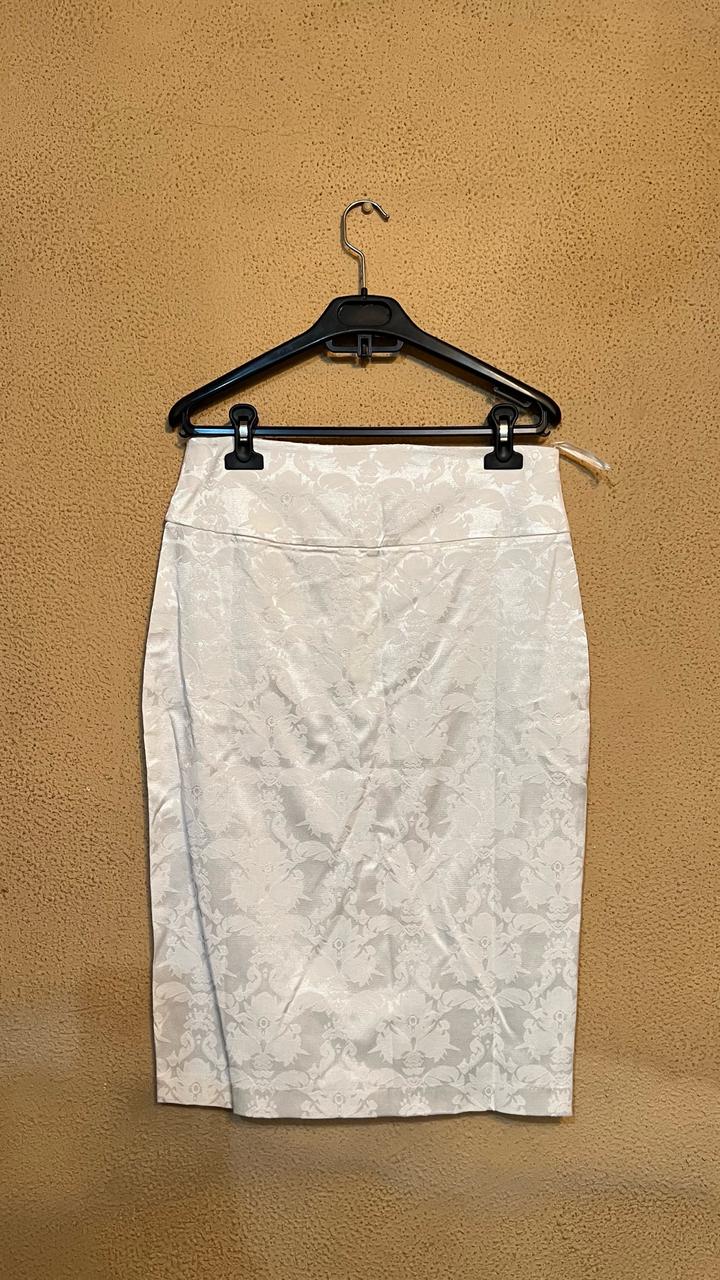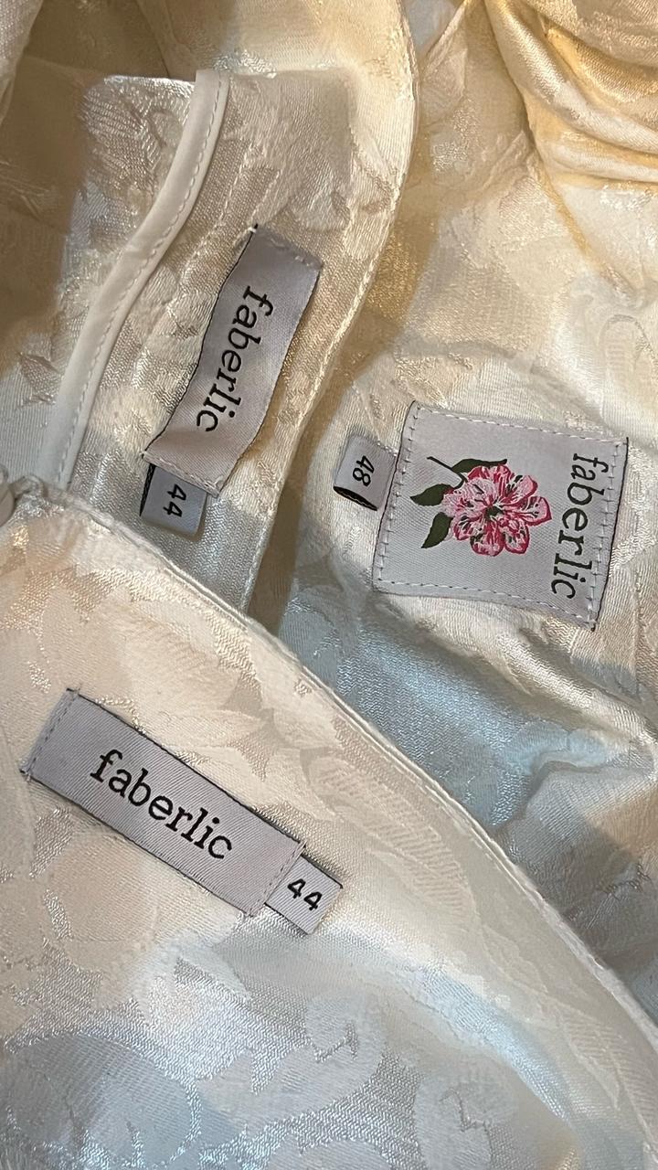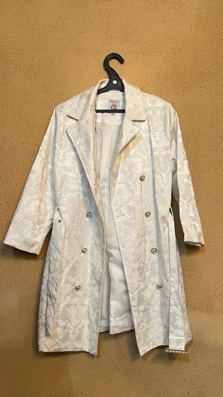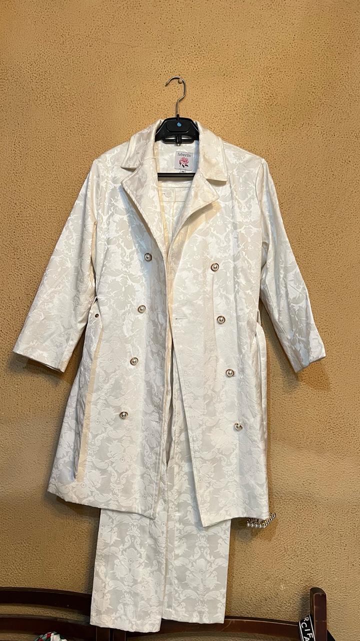 Длинный пиджак 48 размер (с поясом) Брюки и юбка 44 Бело-молочный цвет, атласный с кружевом Артикул: 574710