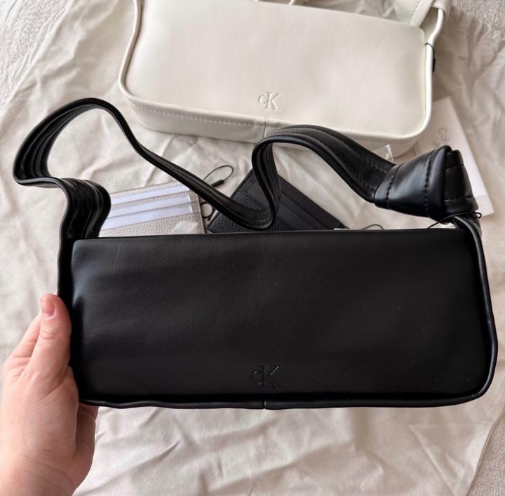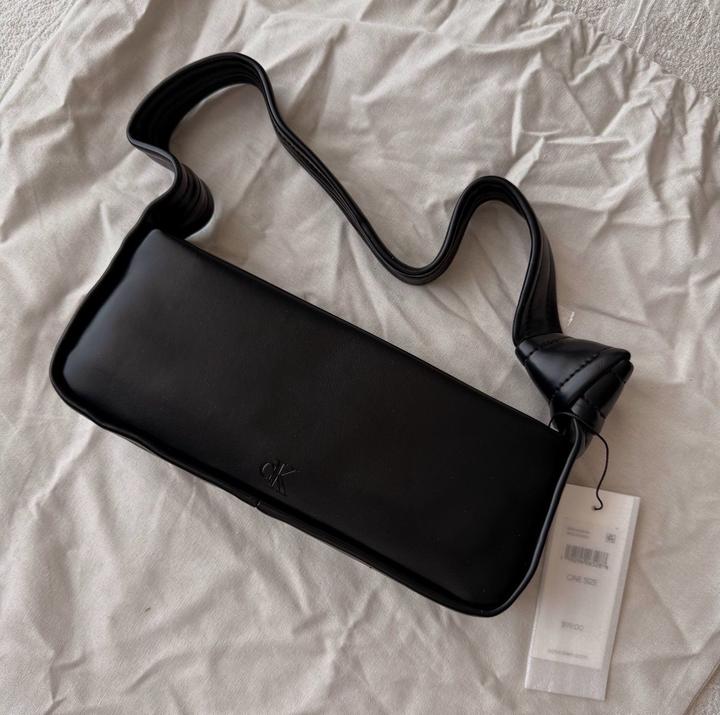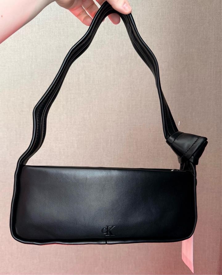 Черная сумка Calvin Klein Knotted Shoulder Bag. Оригинал, привезена из США. Новая, с бирками. Стильная компактная сумка на плечо с узлом на ручке. Плотная эко-кожа, держит форму. Застёжка на молнии, внутри карман для карт. Размер ~26×10×6 см Артикул: 574756