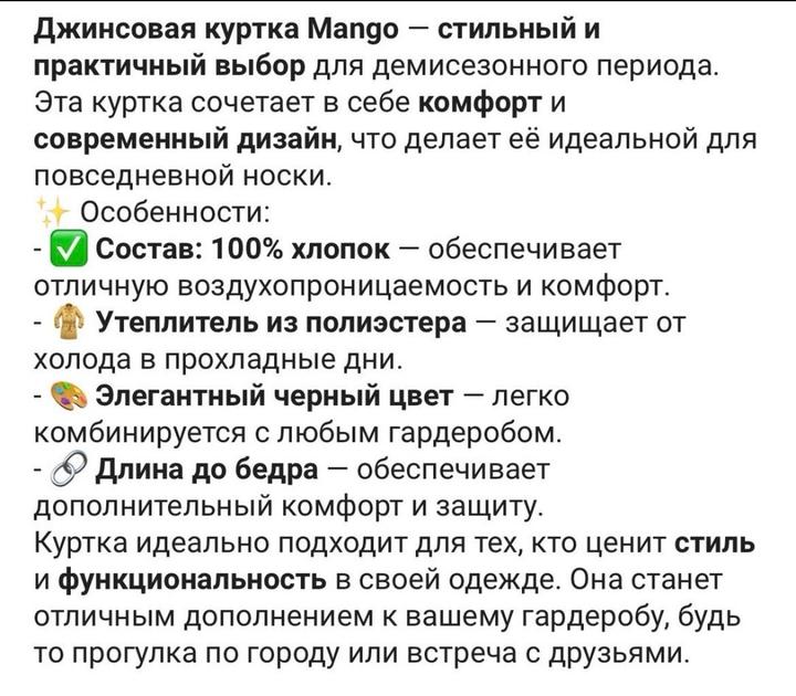 Продаю стильную куртку Mango. Модель с утеплённым подкладом, подойдёт на прохладную весну, осень. Смотрится очень актуально и легко сочетается с разной одеждой. Цвет универсальный, фасон свободный и удобный. Есть большие накладные карманы, застёжка на кнопках. Куртка практичная, тёплая и при этом выглядит очень стильно. Артикул: 574816
