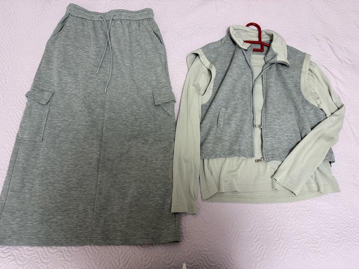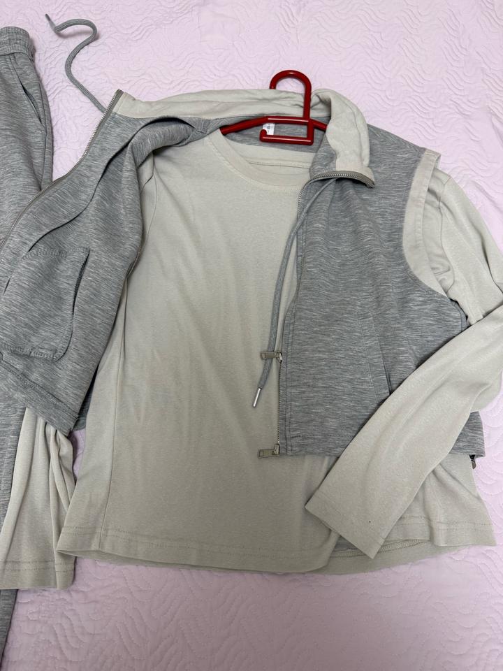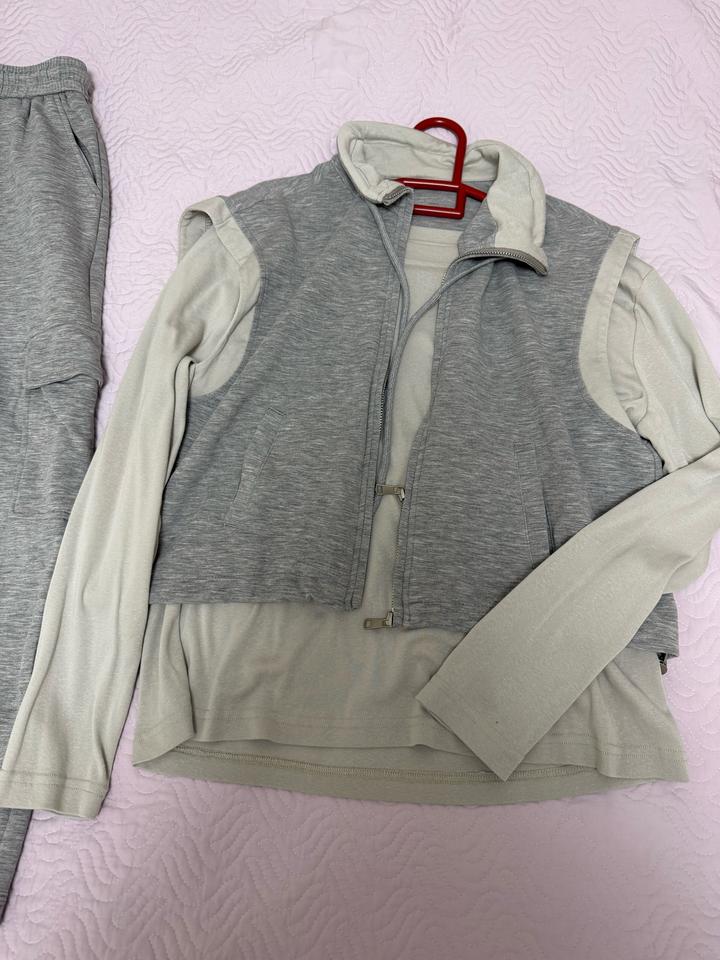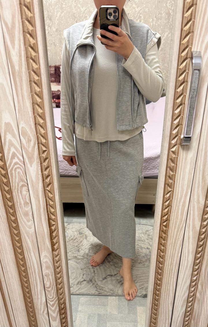 Костюм тройка в сером цвете , в комплекте лонгслив, жилет, юбка. Ткань приятная, лёгкая, хлопок. Новый. Артикул: 574994