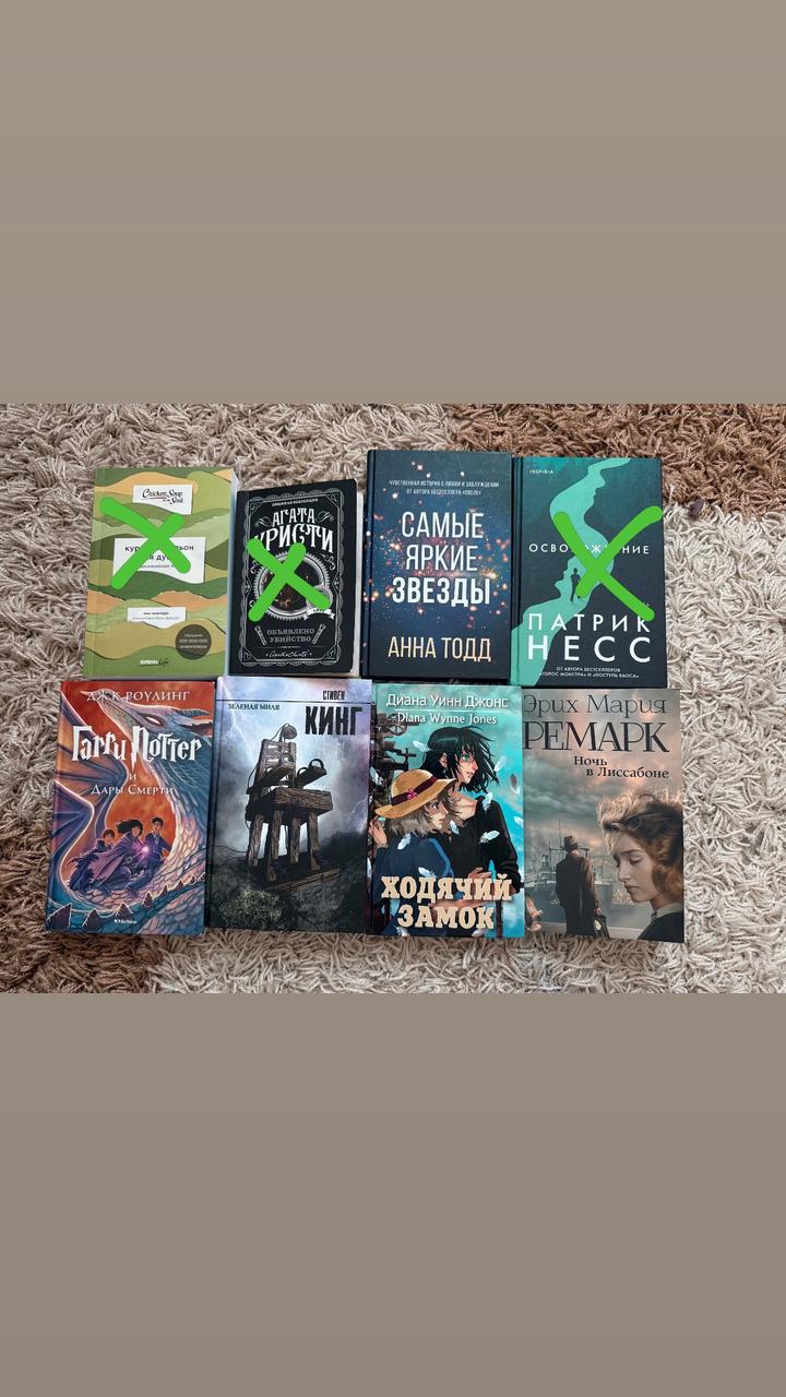 продам книги которые не начала и не дочитала, все в хорошем состоянии просто мне не зашли промокод на первый заказ - 2000тг при заказе от 4000тг «88NFKO» Анна Тодд «самые яркие звезды» 500 тг Гарри Поттер и Дары смерти 3000 тг Стивен Кинг «Зеленая миля» 1500тг Диана Уинн Джонс «Ходячий замок» 3000 тг Эрих Мария Ремарк «Ночь в Лиссабоне» 1500тг Артикул: 575265